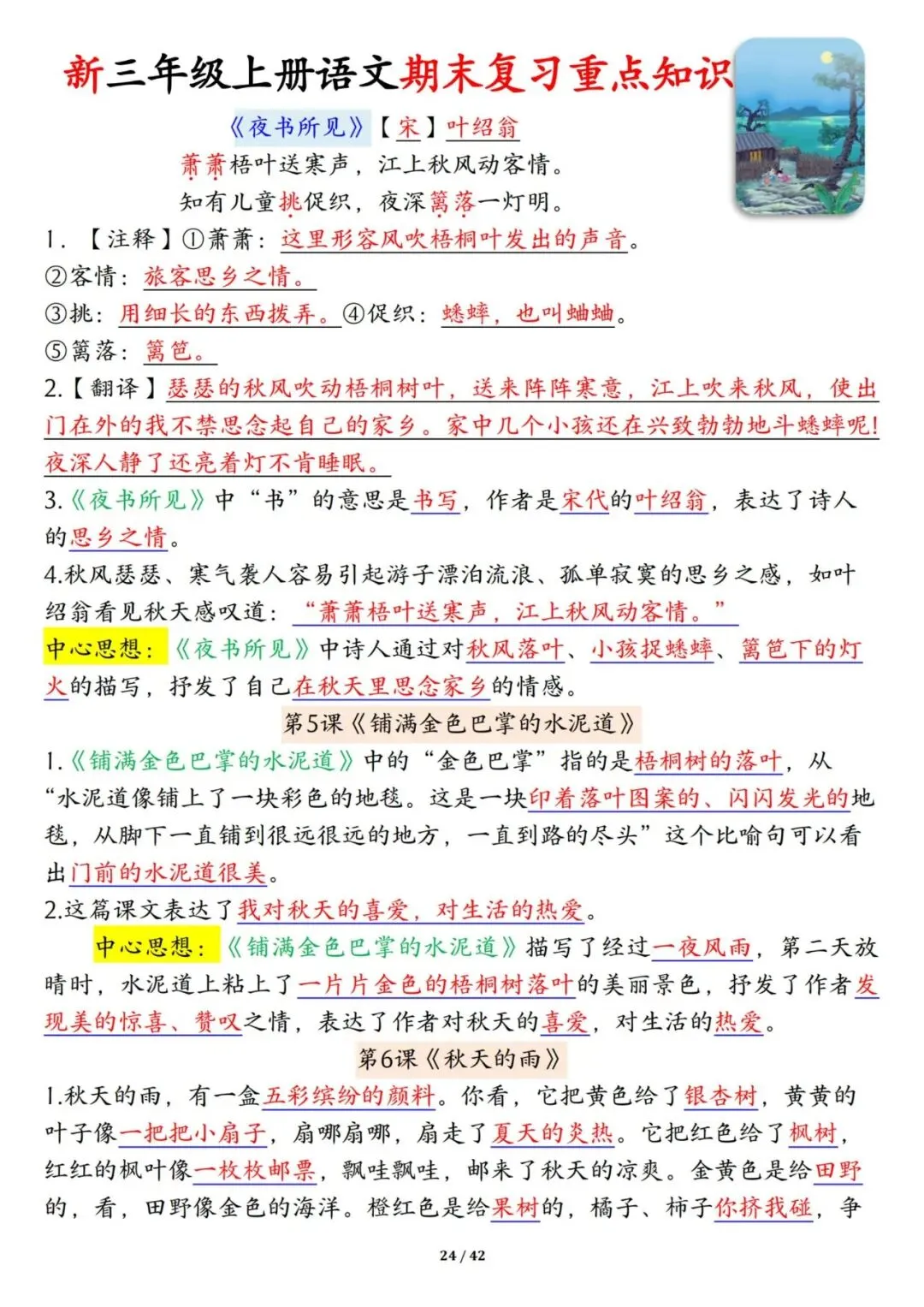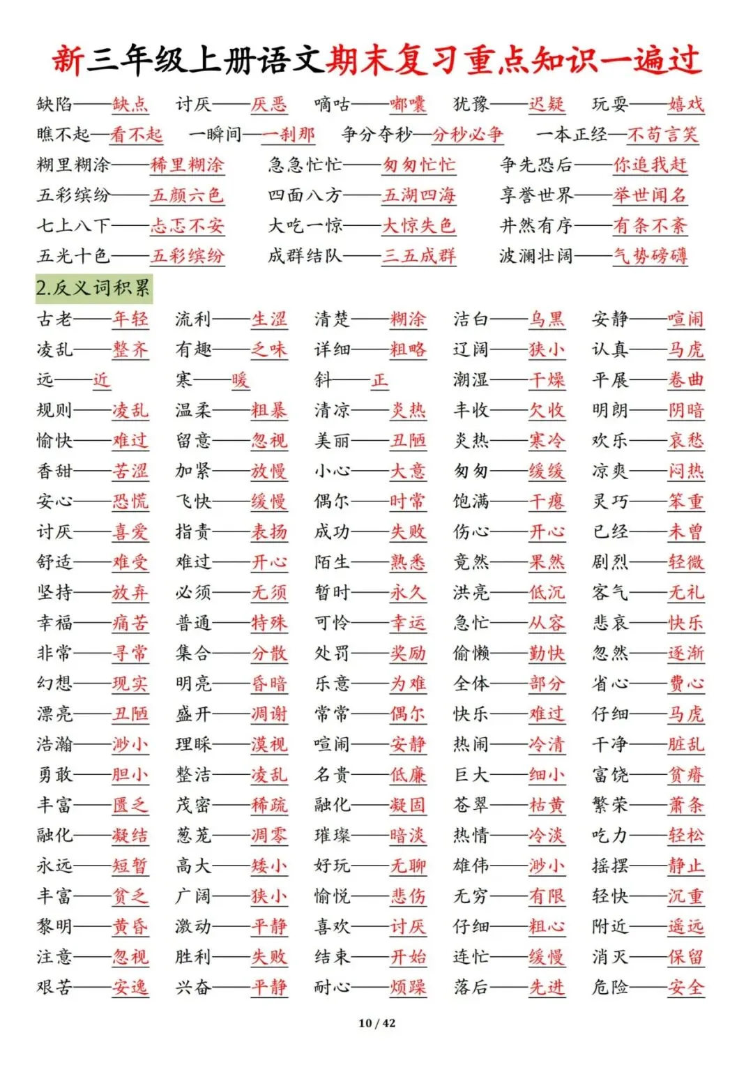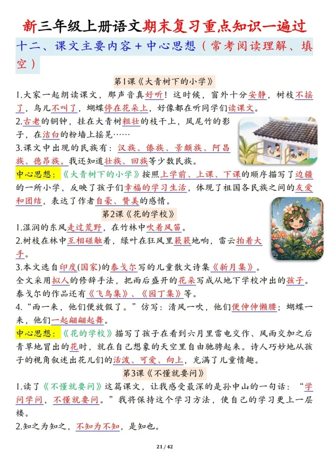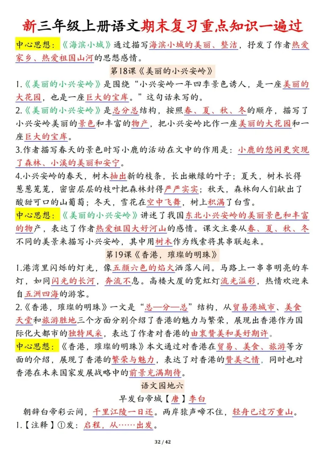 三年级上册语文期末复习重点知识一遍过42页可打印PDF。