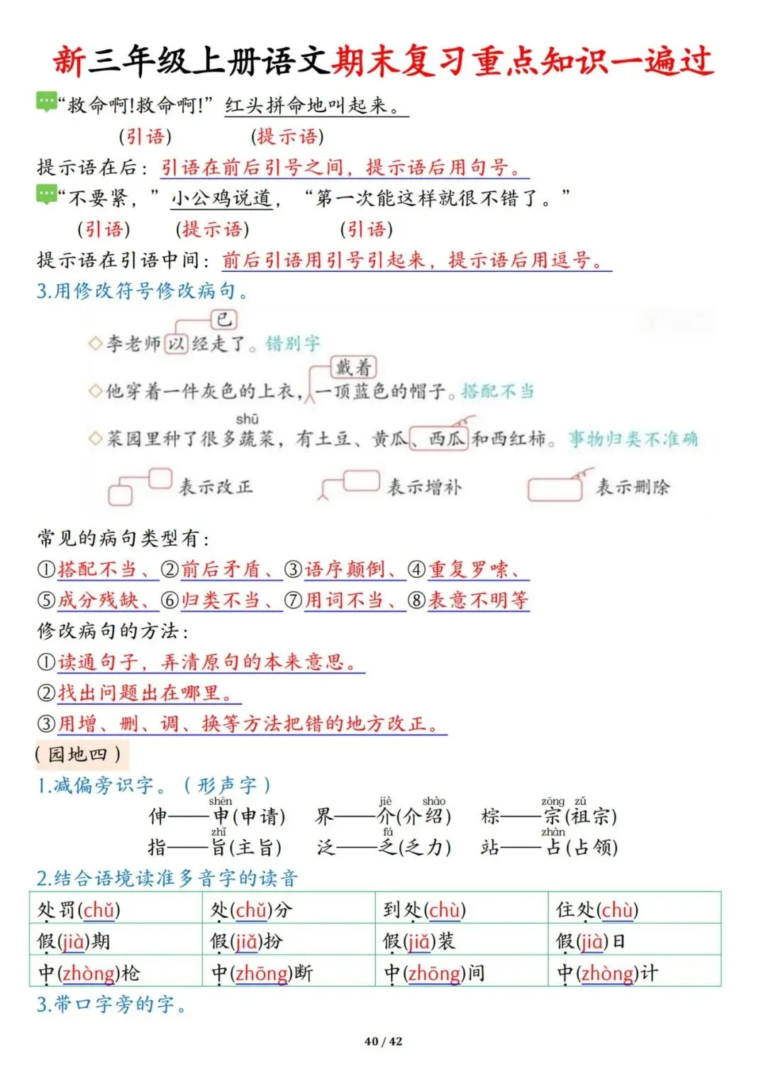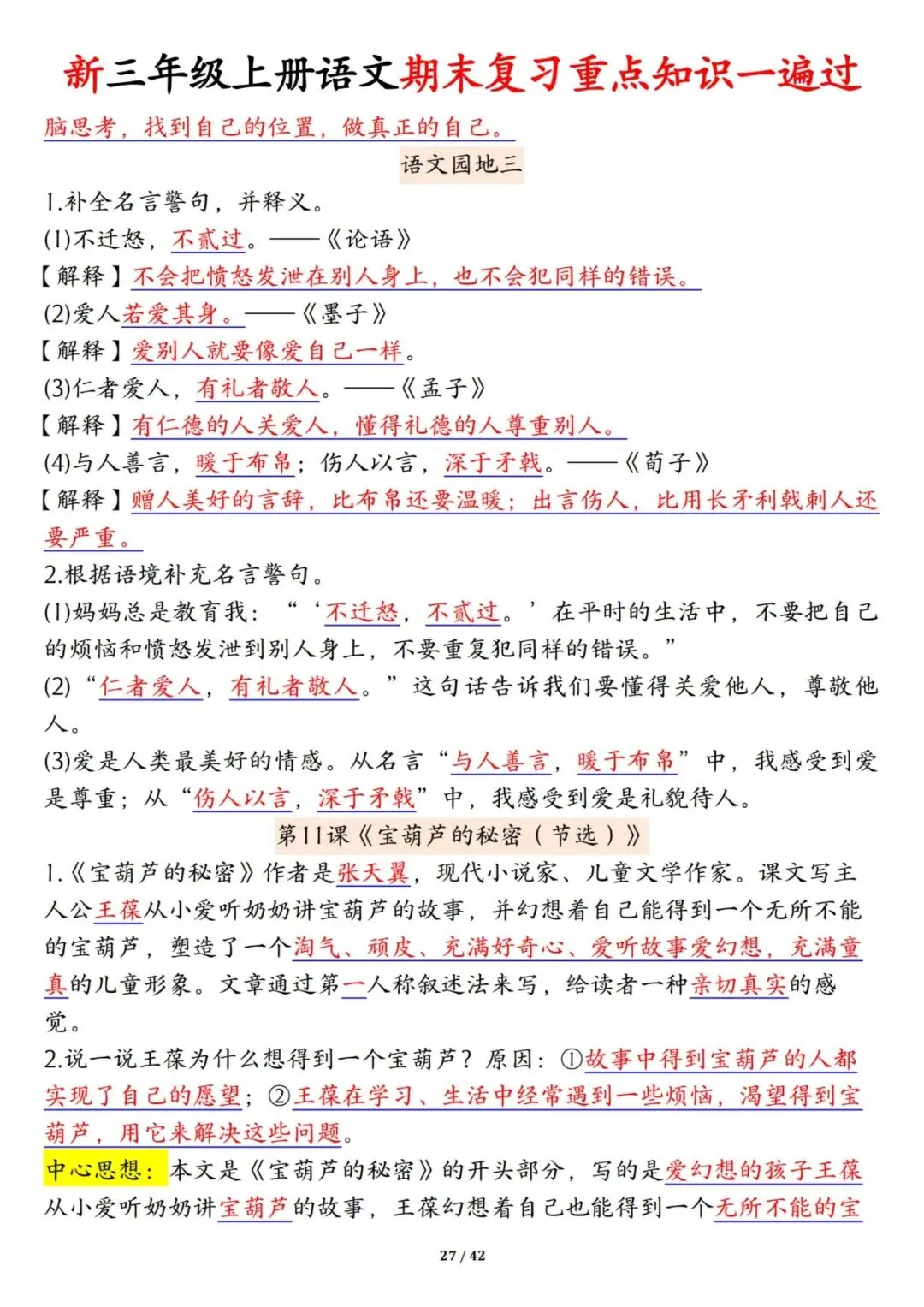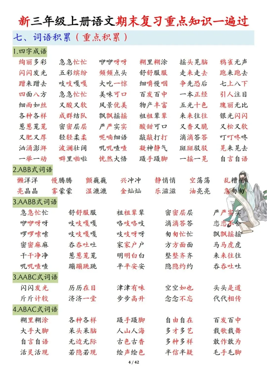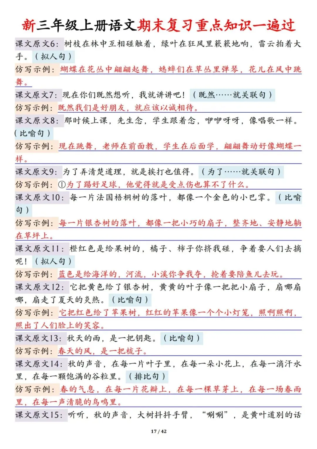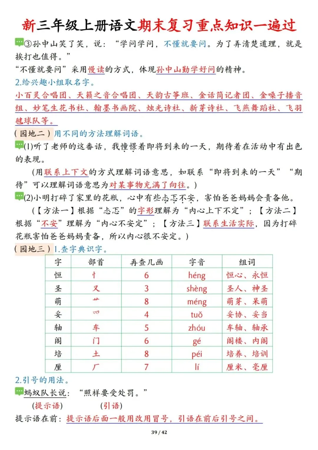 三年级上册语文期末复习重点知识一遍过42页可打印PDF。