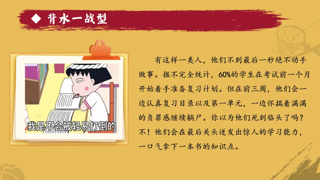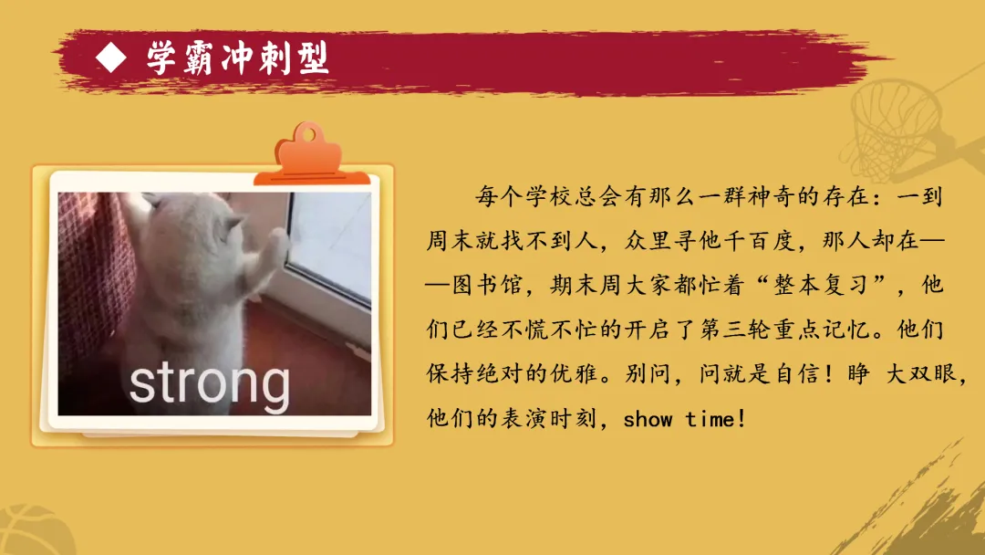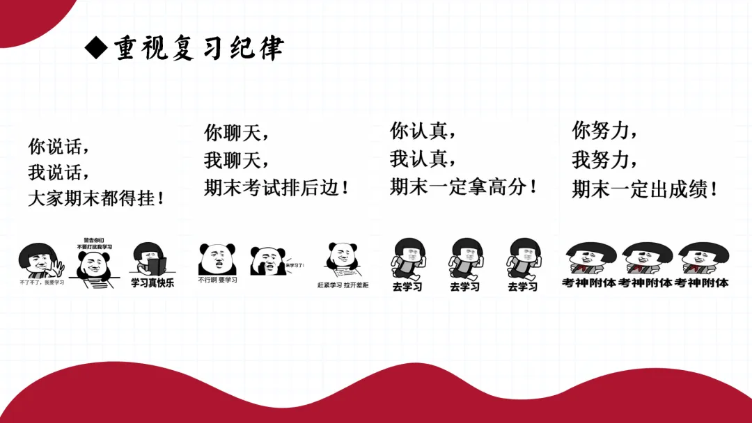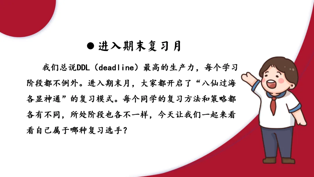 【逐字发言稿】同学们,进入期末复习月,大家都开启了“八仙过海 各显神通”的复习模式。今天我们先来看看几种典型的复习选手类型。