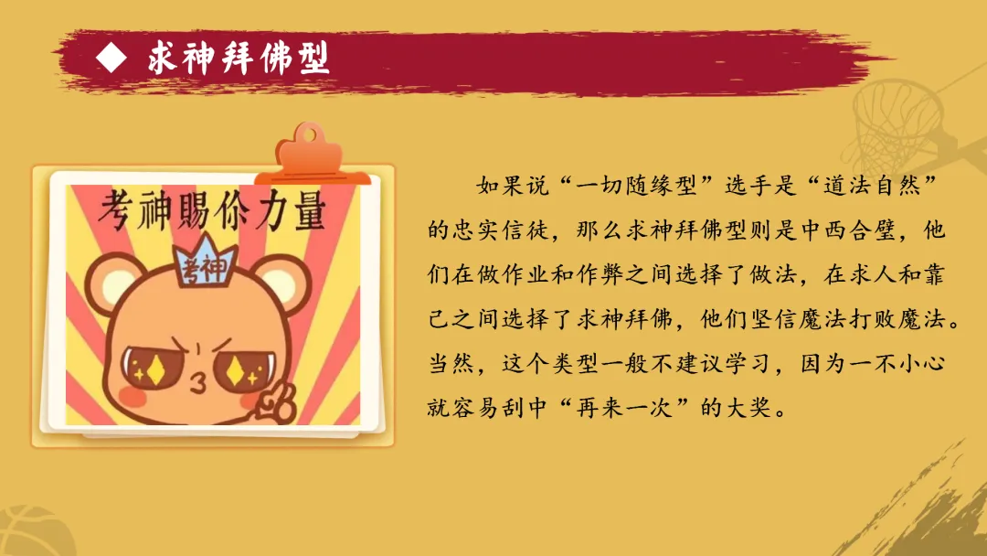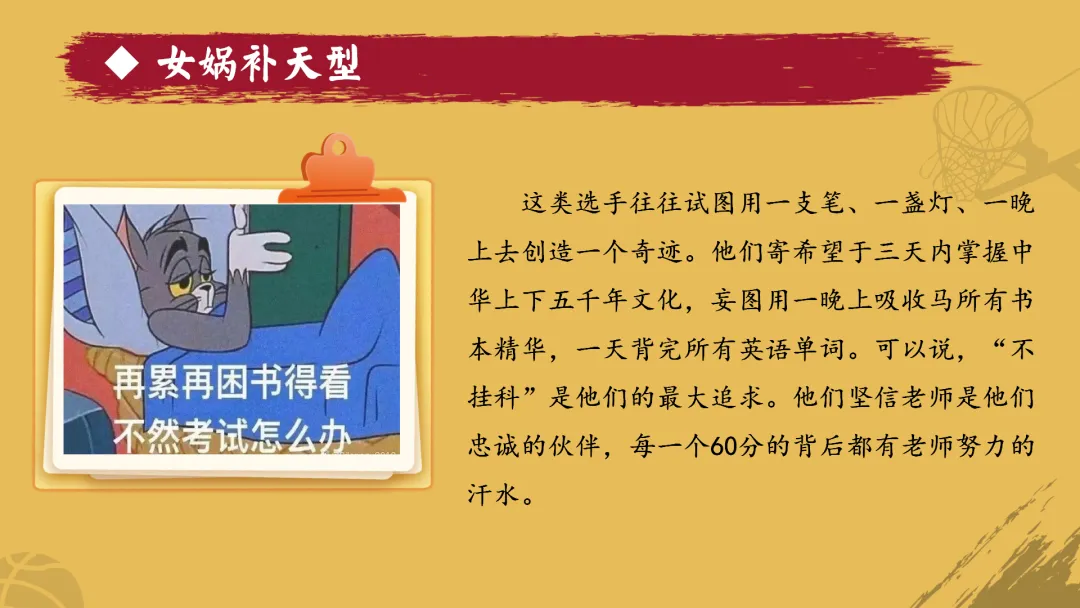 【幻灯片内容】女娲补天型这类选手往往试图用一支笔、一盏灯、一晚上去创造一个奇迹。他们寄希望于三天内掌握中华上下五千年文化,妄图用一晚上吸收马所有书本精华,一天背完所有英语单词。可以说,“不挂科”是他们的最大追求。他们坚信老师是他们忠诚的伙伴,每一个60分的背后都有老师努力的汗水。