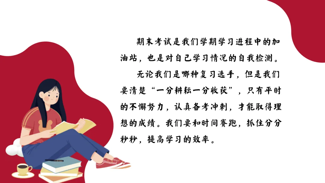 很高兴在这与您相遇,如果您是一位班主任老师,每天除了应对繁重的教学工作,还要加班整理班级、教务、教研、课件PPT资料,请关注下方的“小雨教务资料”,让我们风雨同路、一起成长~今天分享的是初高中通用版考前复习指导主题班会期末复习动员|励志主题班会的ppt课件和配套的发言稿,主题是《期末复习总动员期末复习指导-年度收官战》。期末复习主题班会逐字发言稿