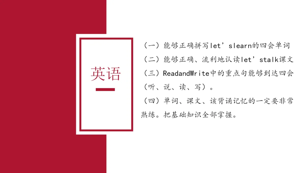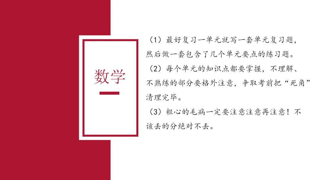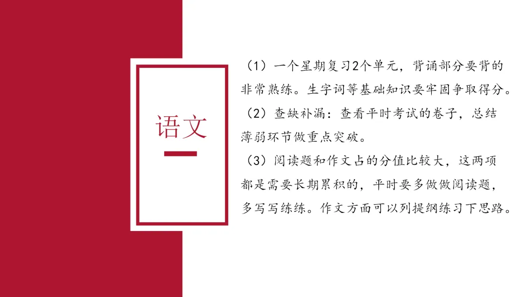 【幻灯片内容】语文(1)一个星期复习2个单元,背诵部分要背的非常熟练。生字词等基础知识要牢固争取得分。 (2)查缺补漏:查看平时考试的卷子,总结薄弱环节做重点突破。 (3)阅读题和作文占的分值比较大,这两项都是需要长期累积的,平时要多做做阅读题,多写写练练。作文方面可以列提纲练习下思路。