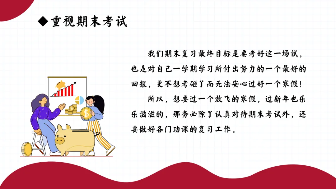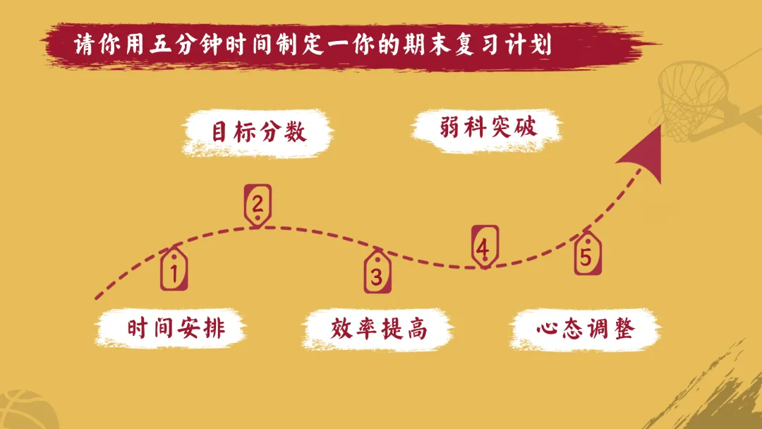 【幻灯片内容】有目标才会有动力,清晰的目标,不是一张一眼望不到头的待办事项清单,而是一个直指人生目标的罗盘。同学们可以制定一个期末复习指南,根据指南高效行动,能快速地取得大大的进步。设定期末考试的目标