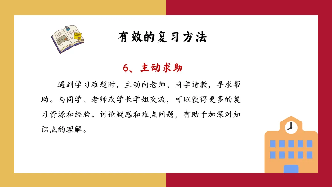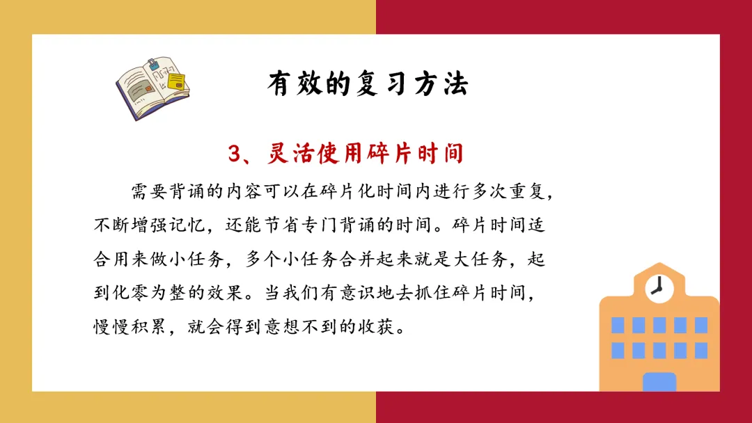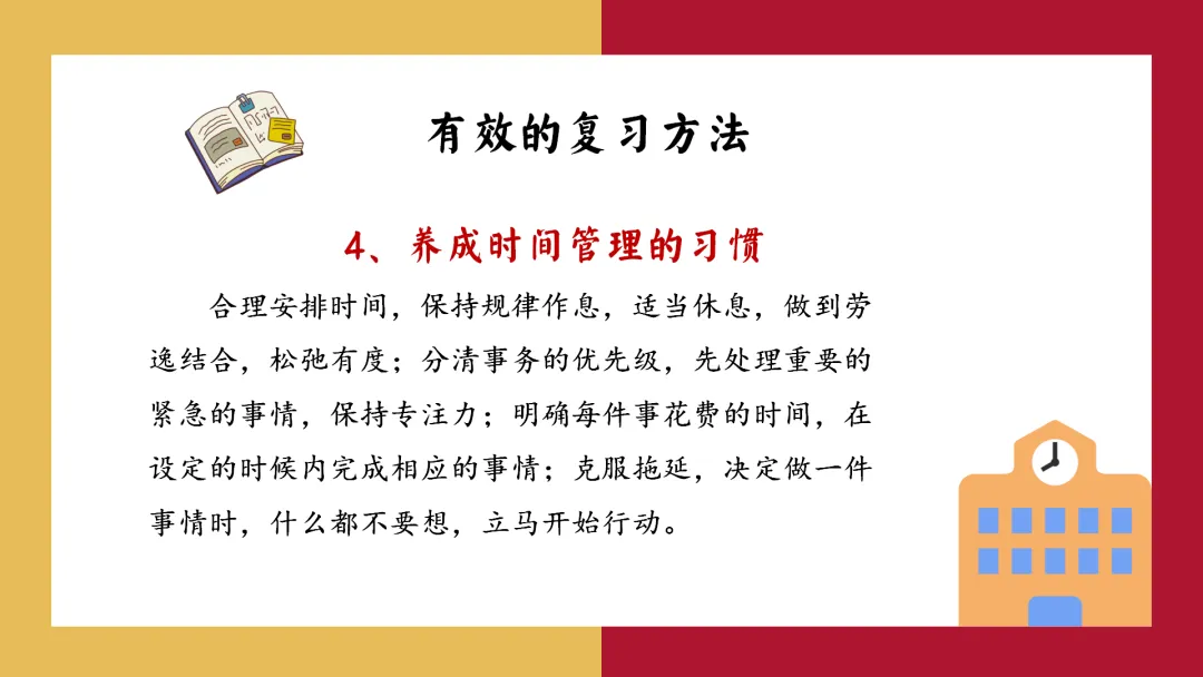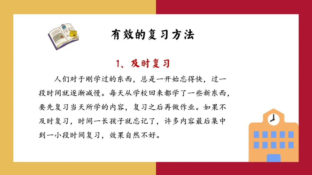 【逐字发言稿】接下来,我们来介绍一些有效的复习方法。首先是及时复习。