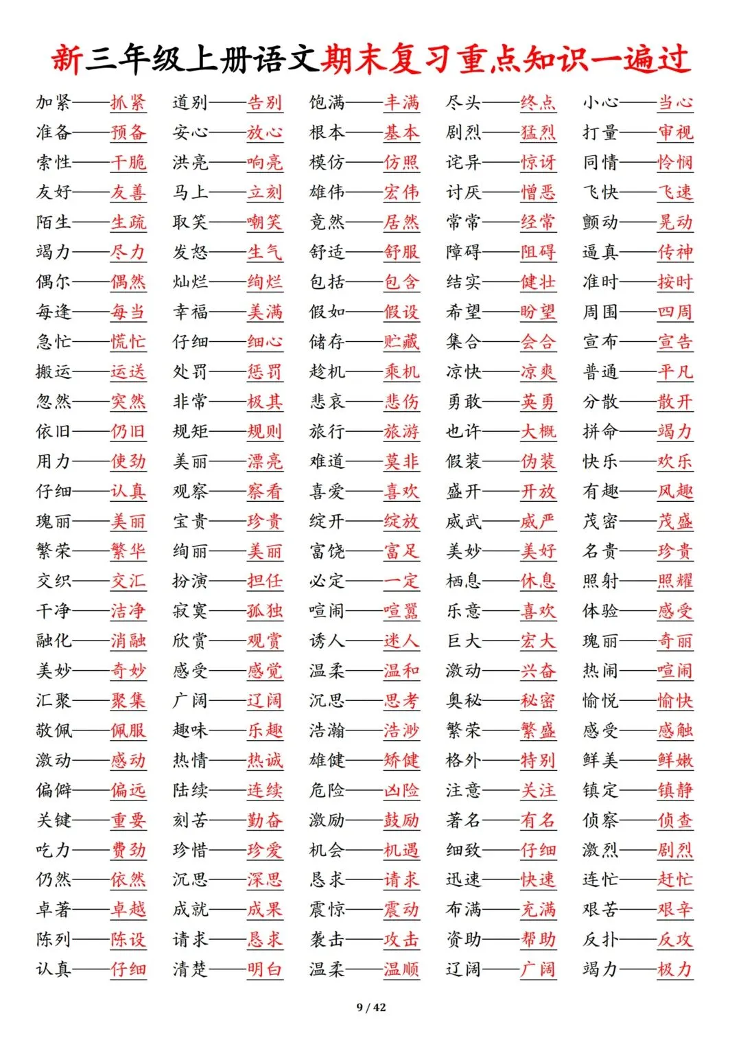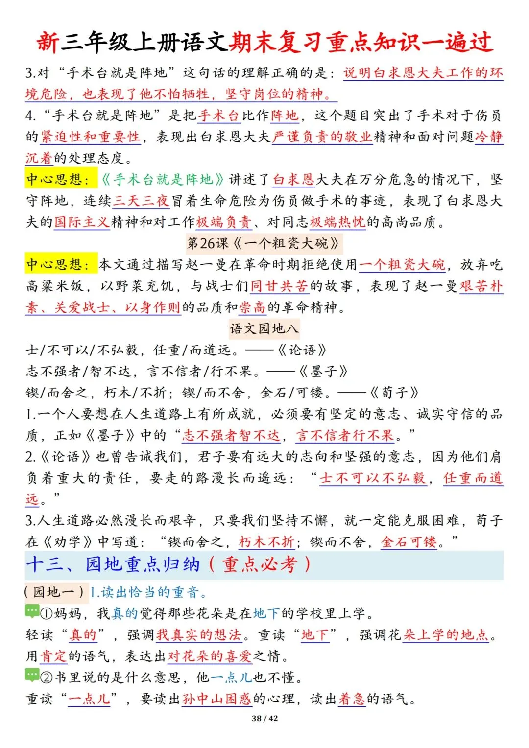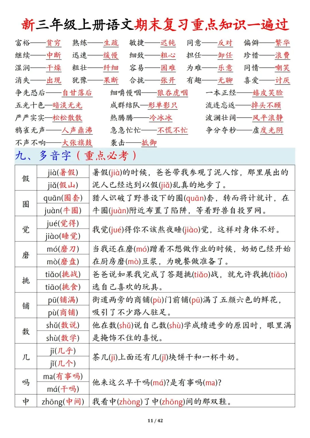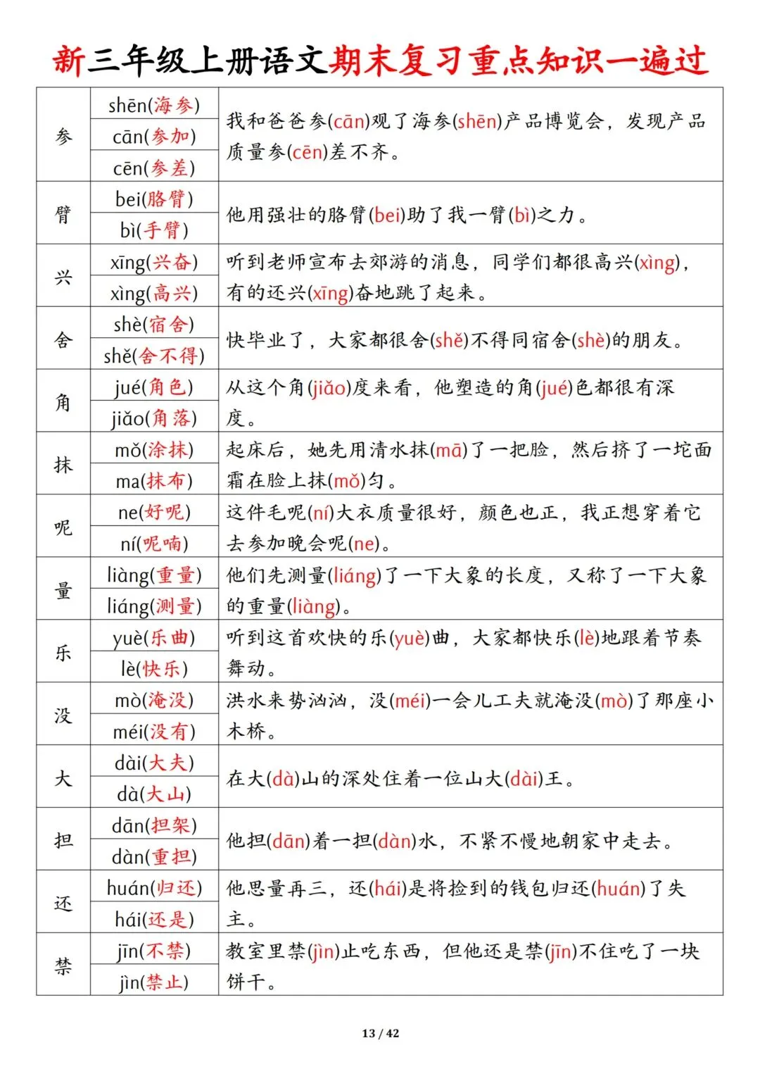 新三年级上册语文期末复习重点知识一遍过(十三考点汇总),共42页!