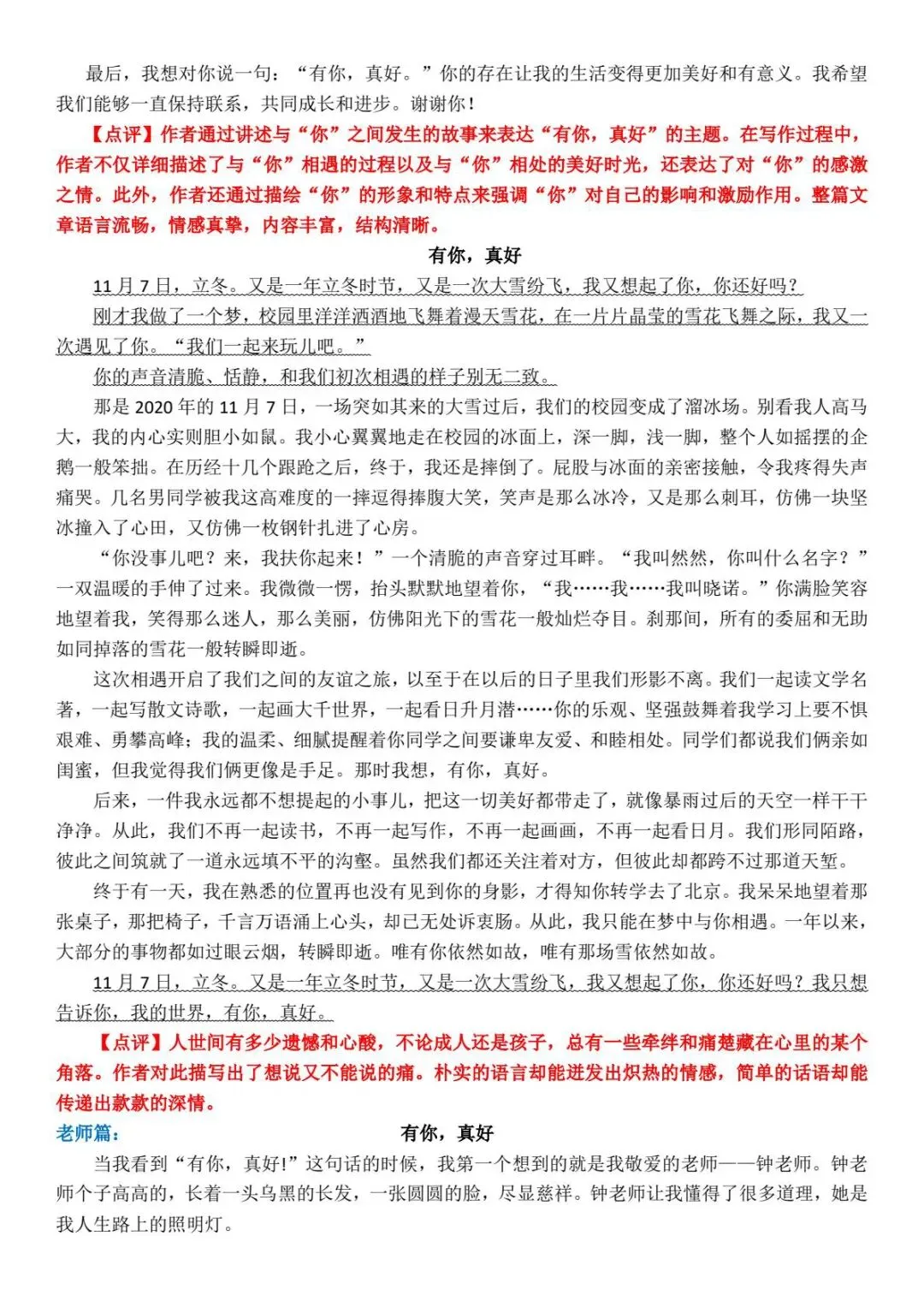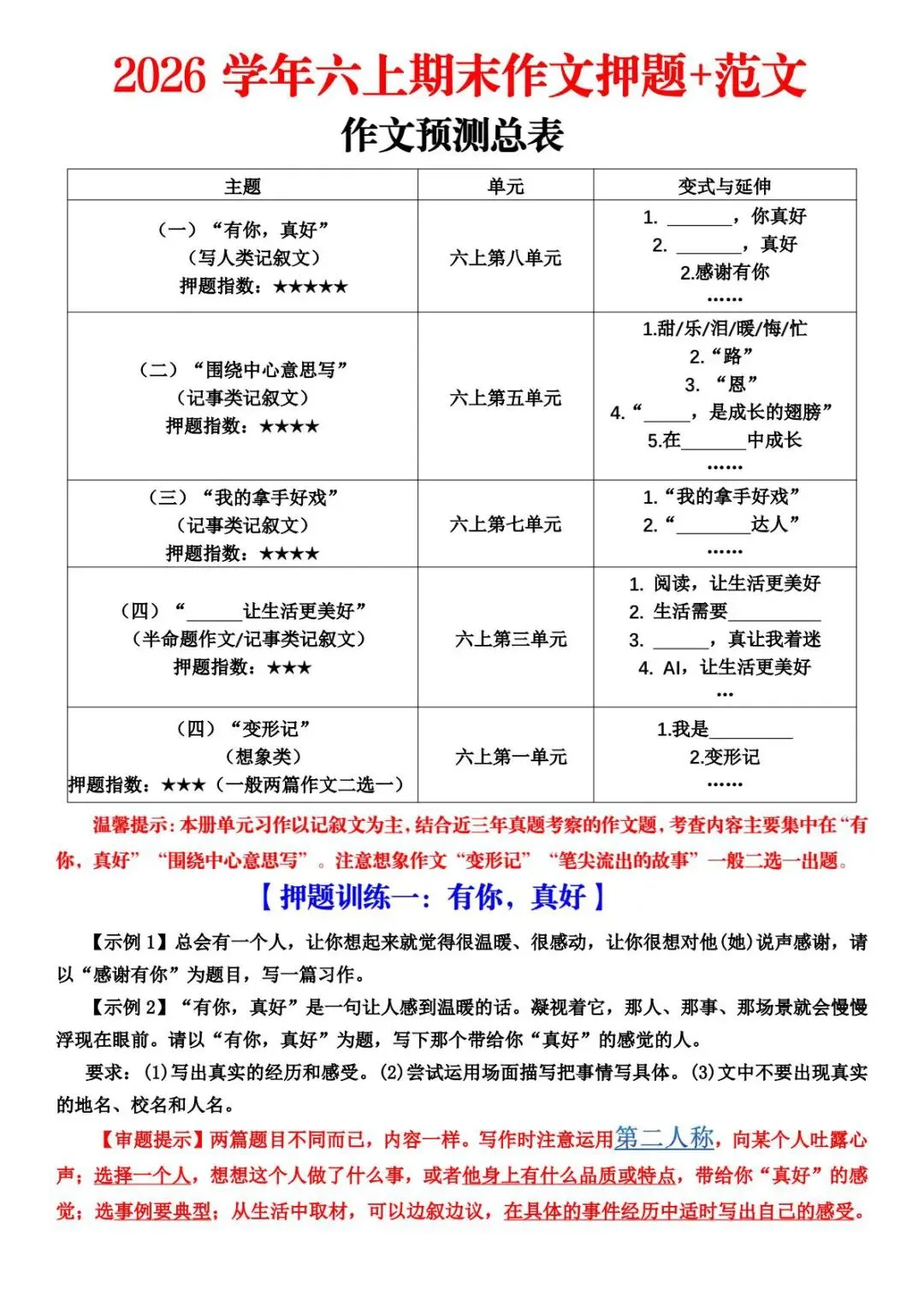 《六年级语文上册期末作文复习资料》涵盖了常考作文题型的预测、题目解析和范文等内容。通过精选的事例和详略得当的叙述,帮助学生明确写作要点,如时间、地点、人物和事件的交代,以及如何突出重点和表达真情实感。资料中提供的考场范文生动具体,有助于学生理解和模仿。此外,资料还强调了观察的重要性,指导学生如何细致观察并抓住事物的突出特点。总体来说,这篇复习资料集对提高学生的作文水平非常有帮助。⭐️学习是长路,陪伴是暖灯。今天的词,明天的题,都是沿途拾起的星光。日积月累,微光成炬,终将照亮孩子的远方!