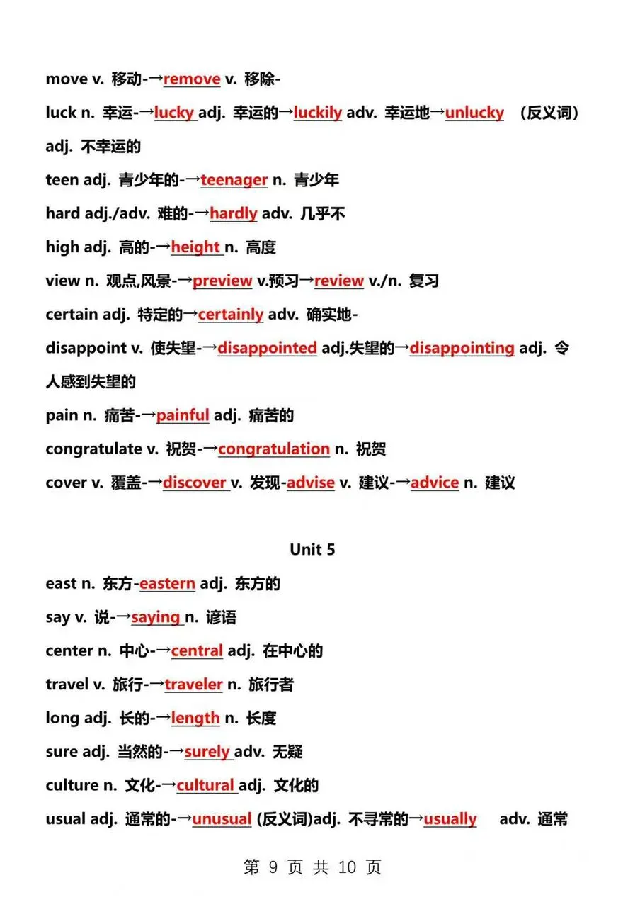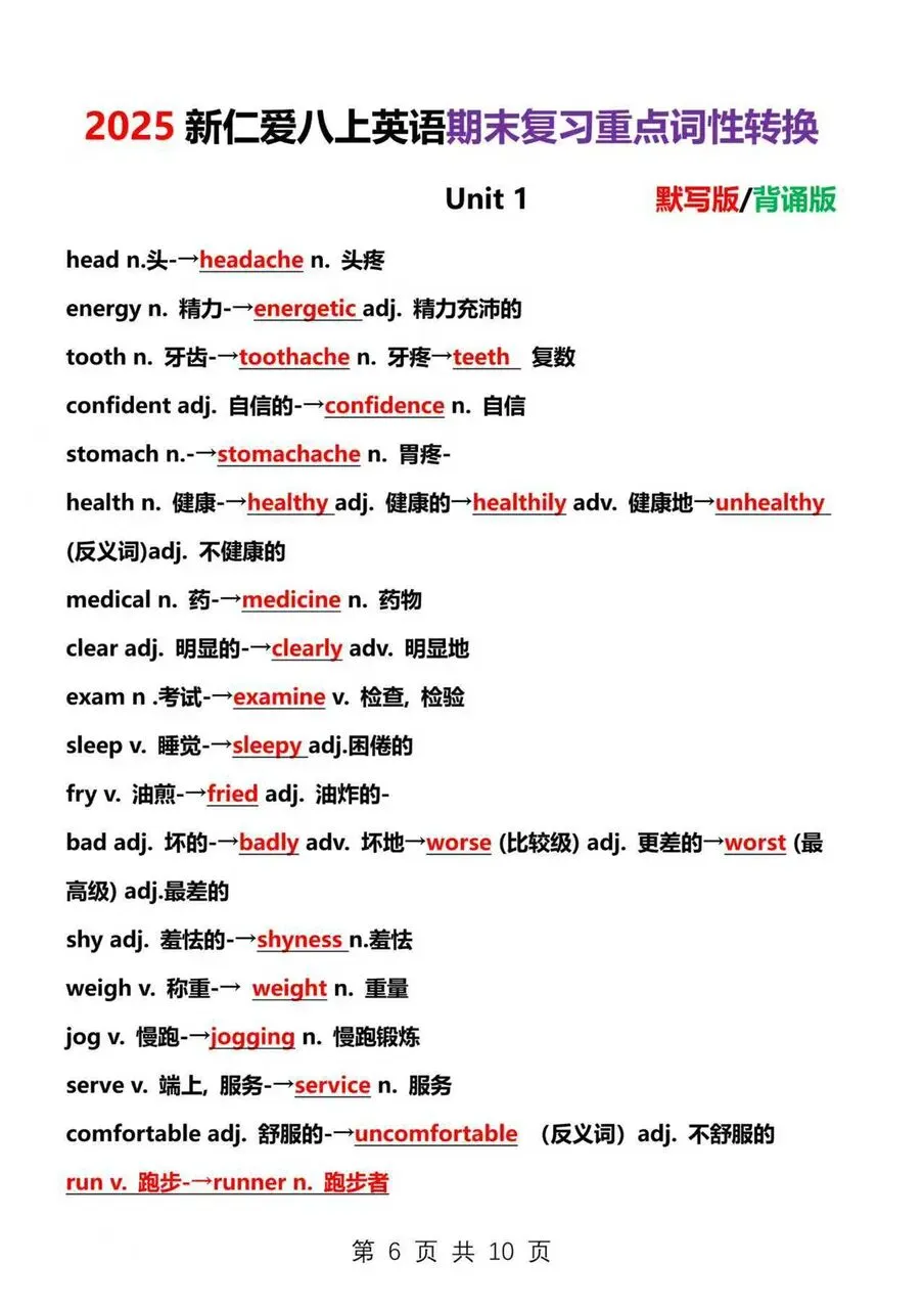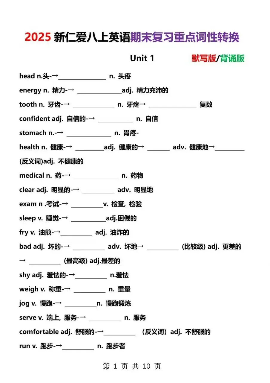 >2025新仁爱八上英语期末复习重点词性转换