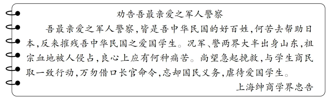 【解析】由“北洋政府”可知,此时处于北洋政府统治时期(1912—1928年),九一八事变发生于1931年,一二·九运动发生于1935年,均与材料时间不符,A、D两项错误。由“况军、警两界大半出身山东,祖宗血被人侵占”“尚望急起挽救,与学生商民取一致行动”等信息可知,此事与山东主权有关,学生因抗议被捕。结合所学巴黎和会将德国在山东的权益转让给日本,引发五四运动可知,该传单的目的是声援五四学生爱国运动,与“济南惨案”无关,B项正确,C项错误。