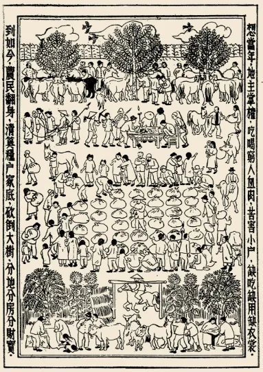 【解析】土地革命战争时期和解放战争时期,中国共产党均实行了废除封建地主土地所有制的土地政策,1947年颁行《中国土地法大纲》,真正实 现了“耕者有其田”。年画中“想当年,地主掌权”“到如今,农民翻 身”“分地分房分财宝”等信息,展现的正是农民获得土地,实现了 “耕者有其田”的历史场景,故A项正确。井冈山革命根据地的建立, 揭开了“工农武装割据”的序幕,与题干信息无关,故排除B项; 1956年底,我国基本上完成了对农业、手工业和资本主义工商业的社会主义改造,标志着生产资料公有制占绝对优势的社会主义经济制度在我国初步建立起来,土地私有制才基本被废除,故排除C项;全面抗战时期,抗日民主政权政治上以“三三制”为原则,经济上实行减租减息政策,题干中“分地分房分财宝”的场景与此不符,故排除D项。