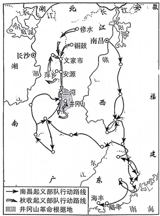 【解析】据图可知,南昌起义爆发后,起义军占领中心城市南昌,随后南下广东,途中在潮汕地区遭敌人围攻后,主要兵分两路,一路转向广东海陆丰地区,一路转战湖南、江西,最终到达井冈山。秋收起义在修水、铜鼓、萍乡等地爆发后,起义军原定夺取长沙,但中途受挫,在文家市决定转战,建立了井冈山革命根据地,开辟了建立农村革命根据地,以农村包围城市,武装夺取政权的道路,体现了党在逆境中艰辛探索工农革命道路的历程,故选B项;国民大革命时期是1924—1927年,而南昌起义、秋收起义发生在国民大革命失败后,选项时间错误,排除A项;土地改革通常是指1947夏在解放区以及1950年起在全国新解放区开展的旨在废除封建性及半封建性剥削制度的土地运动,且材料更侧重于武装斗争和革命道路的整体探索,而非土地改革的具体实践,排除C项;新民主主义革命胜利于1949年新中国成立时实现,材料显示的是革命早期阶段的探索,排除D项。