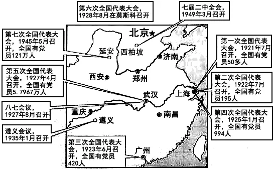 图6是中国共产党建立至中华人民共和国成立间部分重要会议示意图。从图中任选两次会议,根据材料并结合所学知识,简析两次会议间中国共产党的发展,并说明其原因。(要求:明确列出两次会议,观点正确,史实准确,论证充分,表述清晰。)
