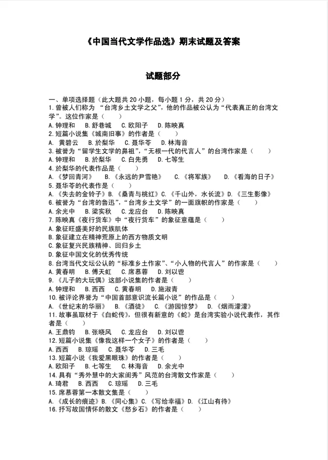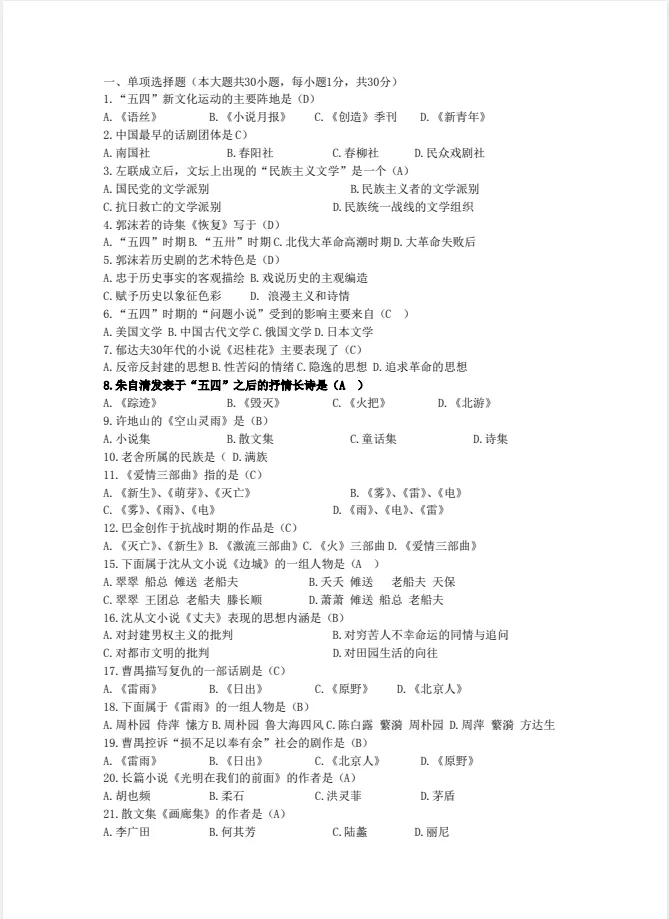 >复习资料:中国当代文学 笔记+知识点+答案 +试卷 PDF