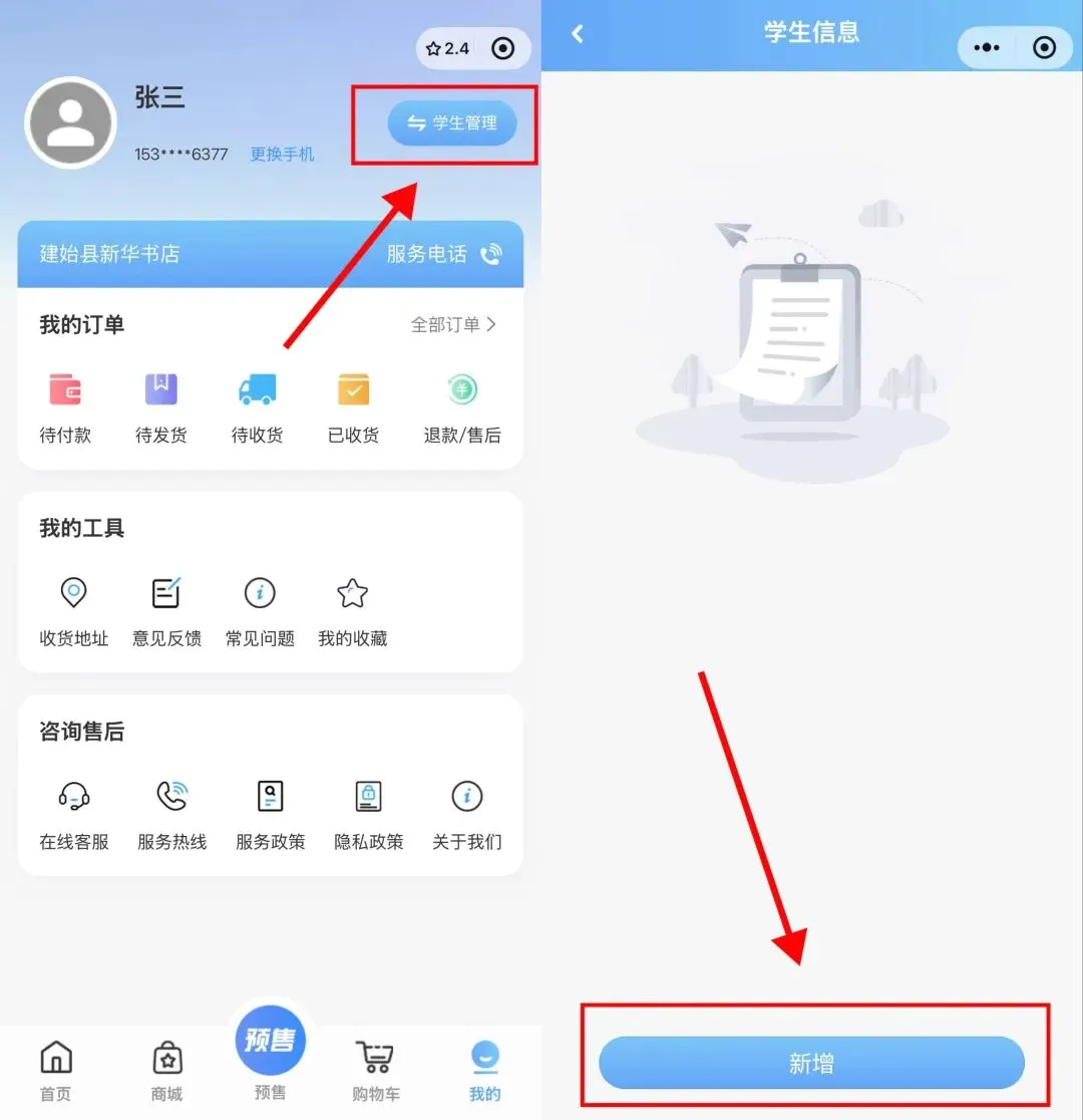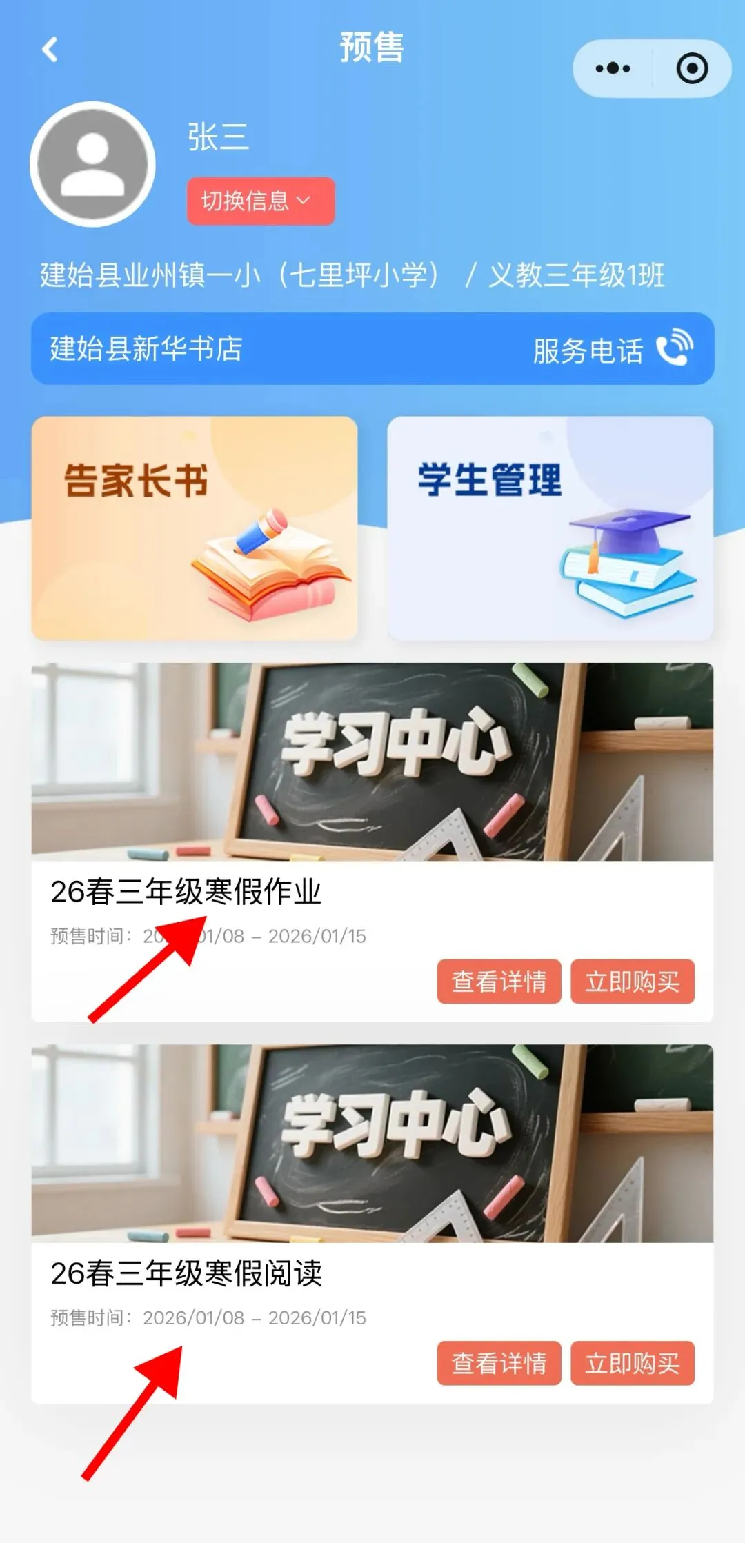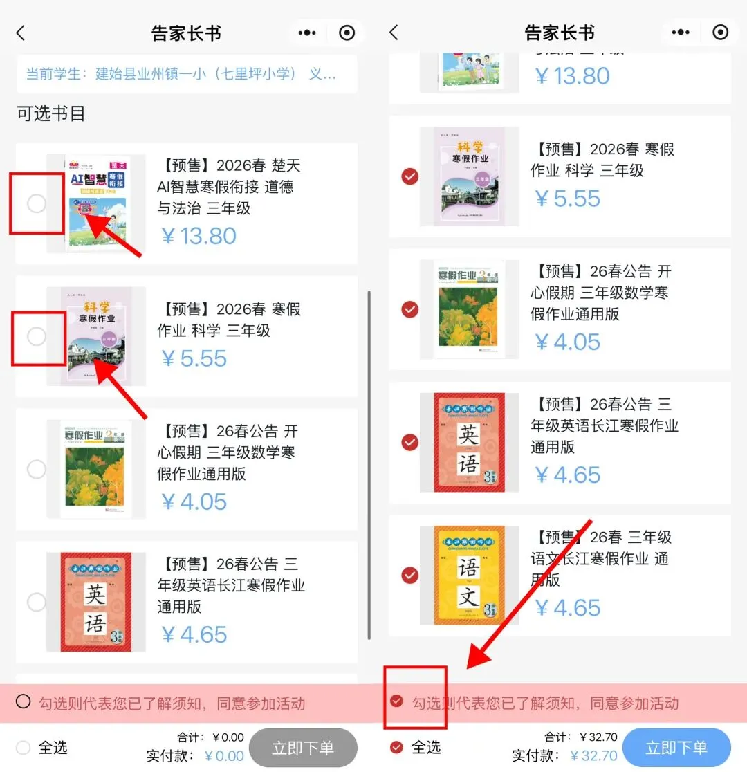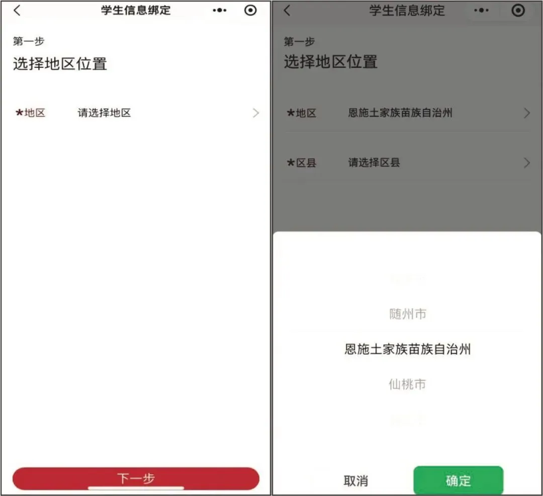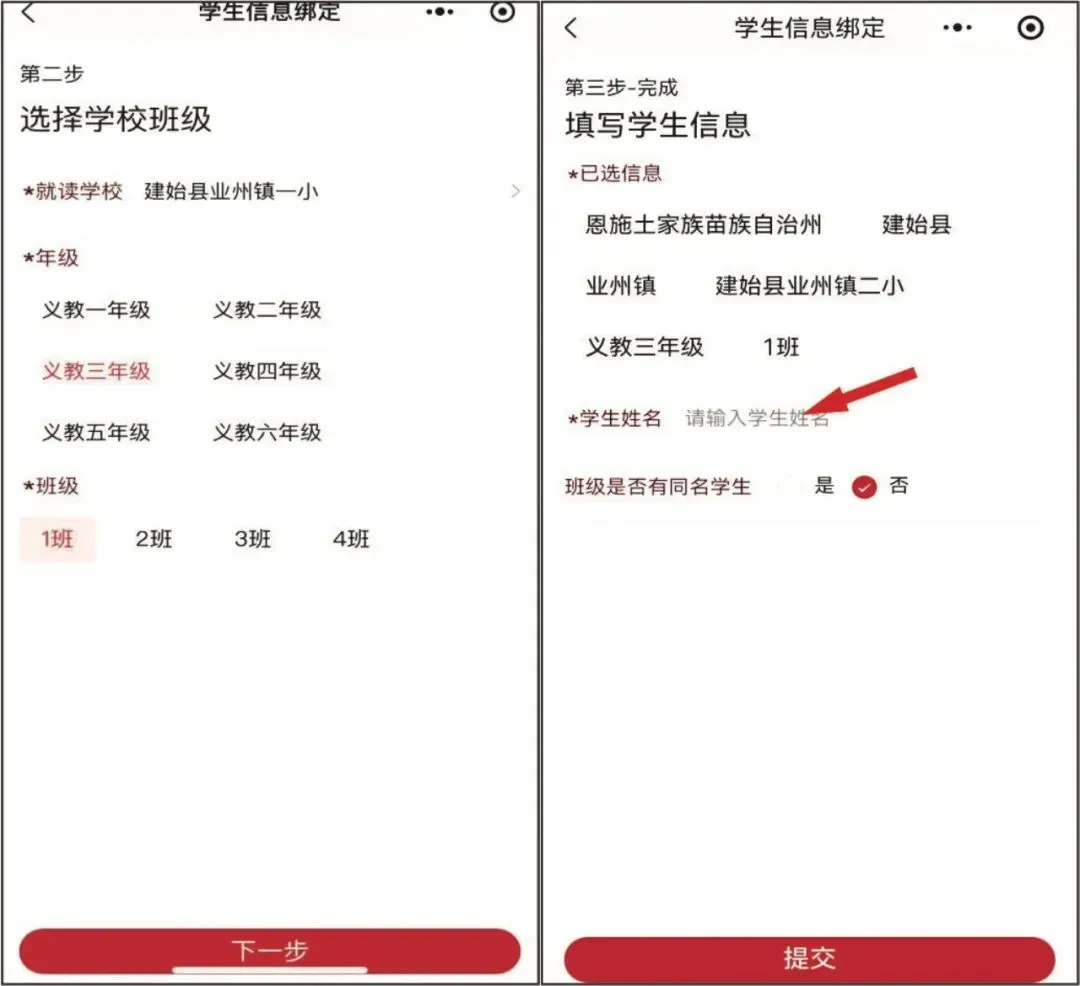 信息填写:请准确填写学生所在片区、学校、年级、班级和姓名(如有同班同姓名的学生才填身份证号)务必确保信息准确无误后再提交。若填写错误(错误信息已下单支付的,请先申请退款待审核收到退款后),返回首页,点击“我的”--“学生信息”--“解绑”,重新录入即可。
