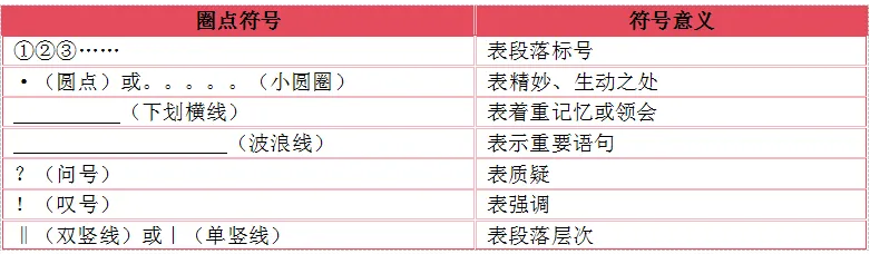 圈点,即在阅读名著时,用一套约定俗成的符号对重要的字、词语、句子或段落做出标记。常用的圈点符号如下: