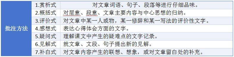 批注,“批”即批语或评语,“注”即注释。批注就是在空白处写上自己的评语或注释。批注的方法如下表: