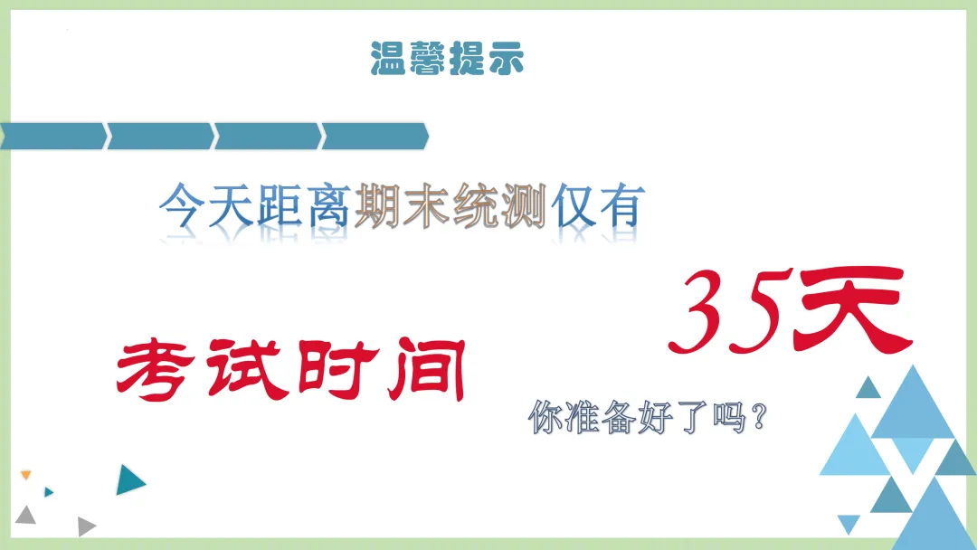 距离期末统测仅有35天,时间紧迫,你准备好了吗?让我们珍惜每一分每一秒,为期末考试而努力。