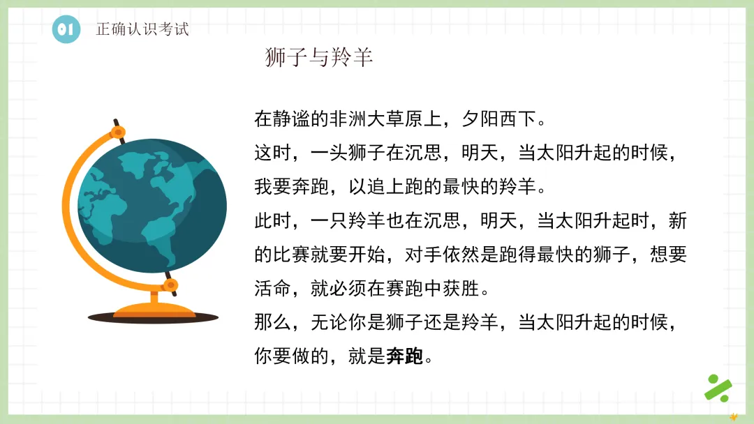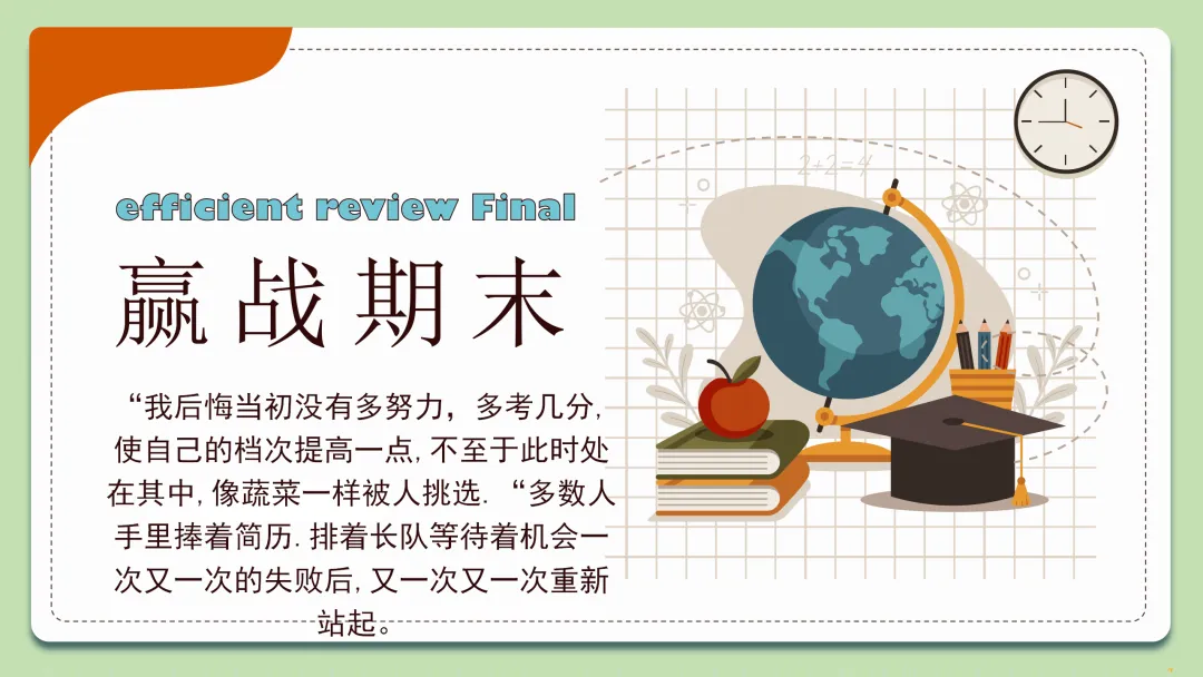 很高兴在这与您相遇,如果您是一位班主任老师,每天除了应对繁重的教学工作,还要加班整理班级、教务、教研、课件PPT资料,请关注下方的“春雨教务资料”,让我们风雨同路、一起成长~今天分享的是初高中通用版考前复习指导主题班会期末复习动员|励志主题班会快闪的ppt课件和配套的发言稿,主题是《挑战自我,在竞争中向上》。期末动员主题班会逐字发言稿