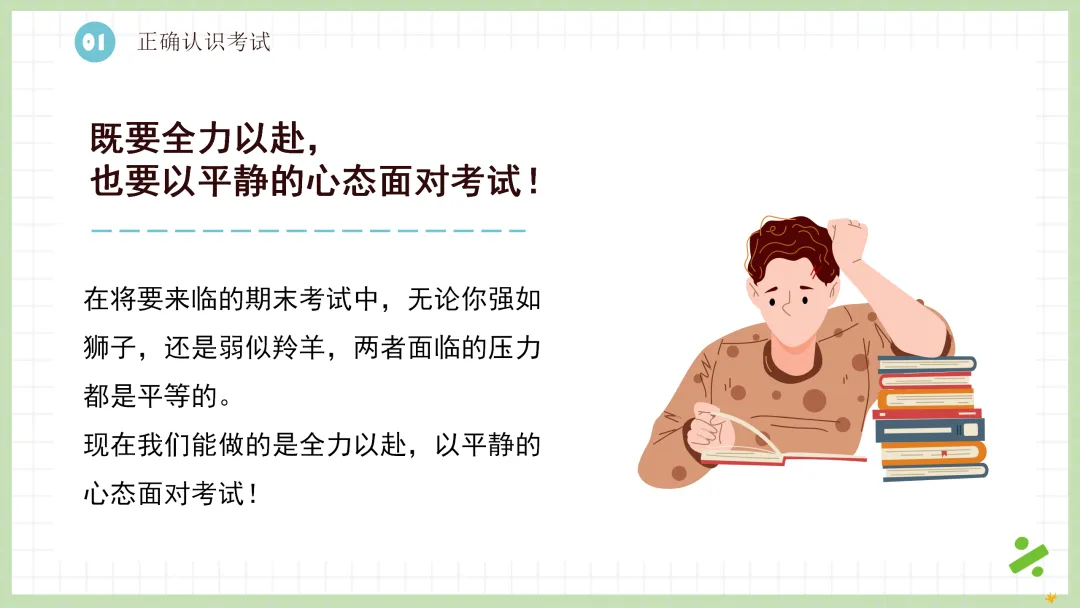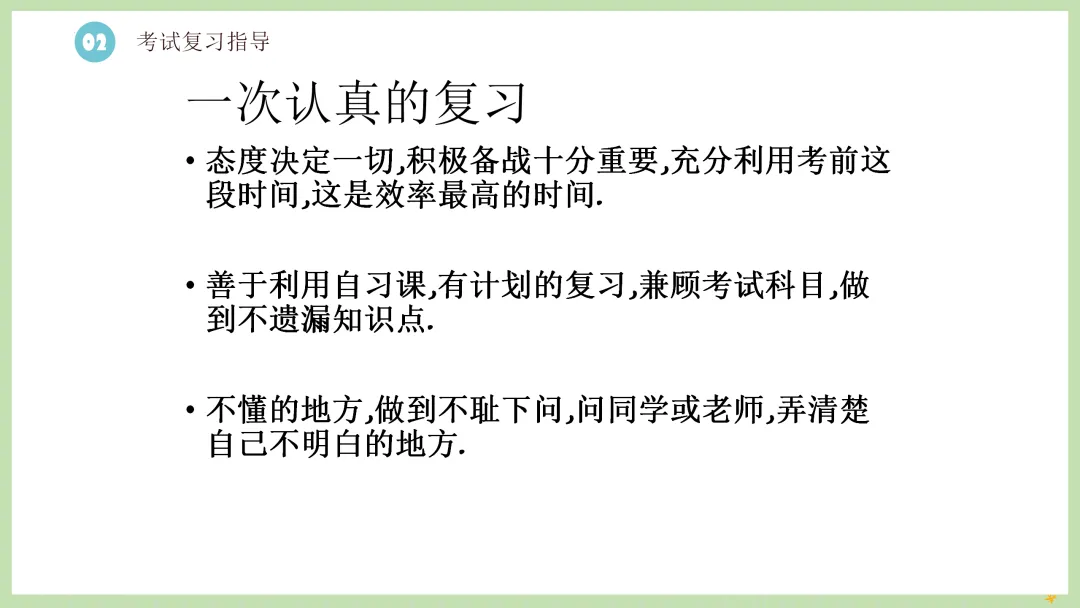 一次认真的复习,态度决定一切,积极备战十分重要,充分利用考前这段时间,这是效率最高的时间。善于利用自习课,有计划的复习,兼顾考试科目,做到不遗漏知识点。不懂的地方,做到不耻下问,问同学或老师,弄清楚自己不明白的地方。让我们认真复习,为期末考试做好充分准备。