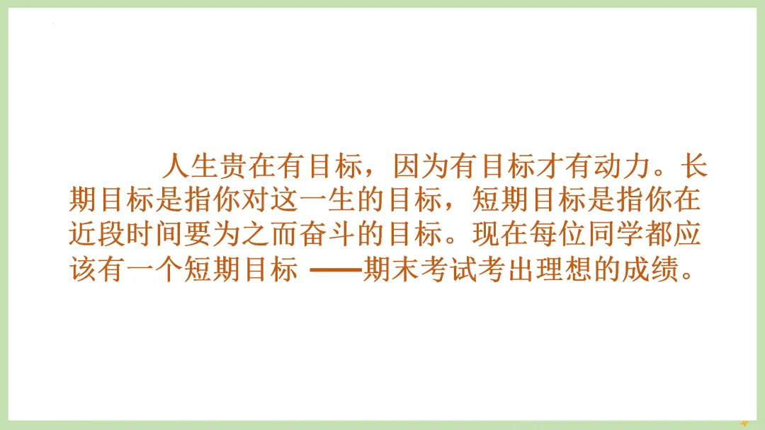 人生贵在有目标,因为有目标才有动力。长期目标是指你对这一生的目标,短期目标是指你在近段时间要为之而奋斗的目标。现在每位同学都应该有一个短期目标——期末考试考出理想的成绩。让我们为了这个目标,努力奋斗。