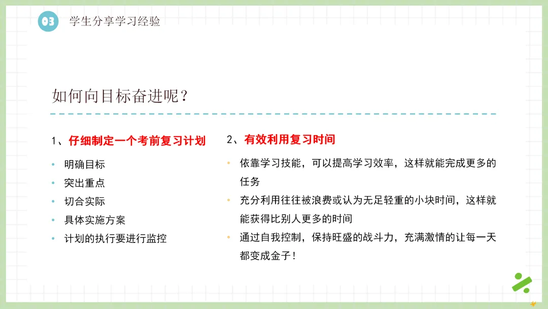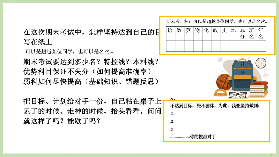 在这次期末考试中,怎样坚持达到自己的目标?写在纸上,期末考试要达到多少名?特控线?本科线?优势科目保证不失分(如何提高准确率),弱科如何尽快提高(基础知识、错题反思)。把目标、计划给对手一份,自己粘在桌子上一份,累P17:高效实施