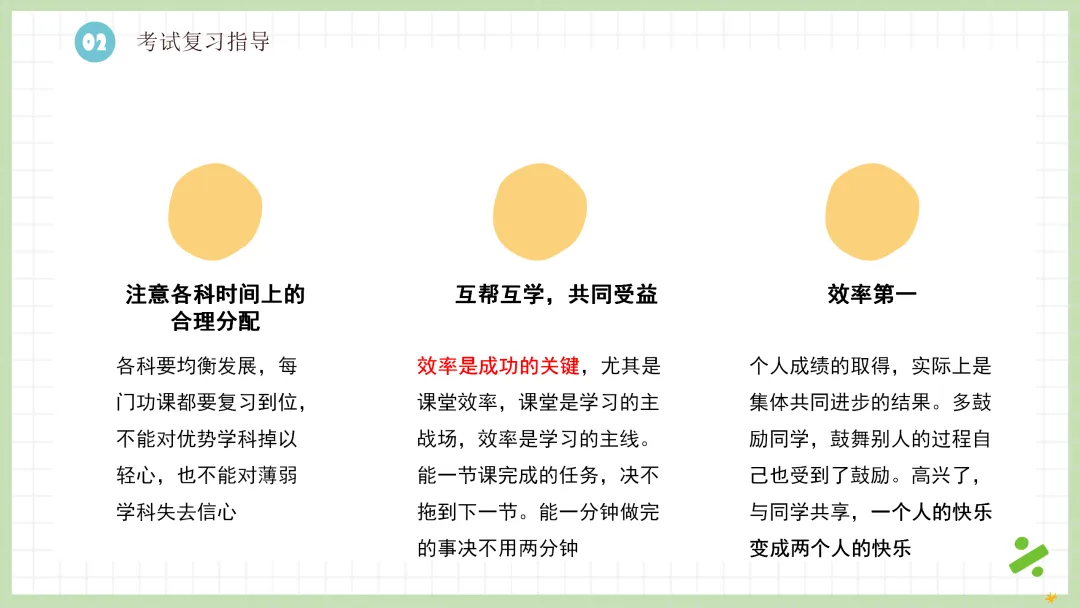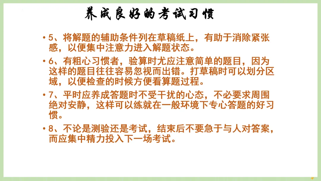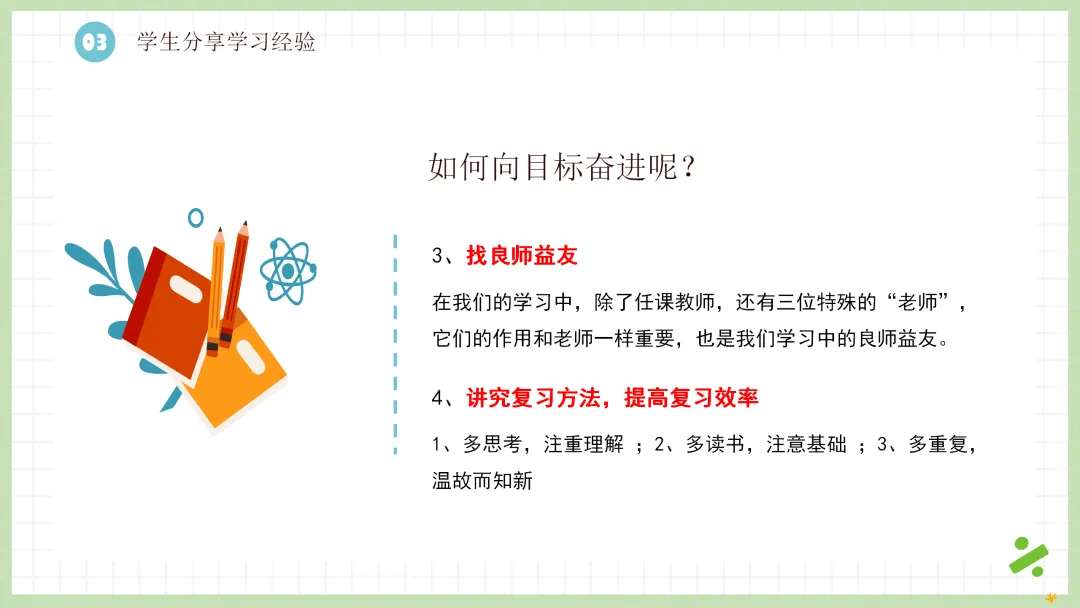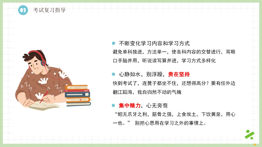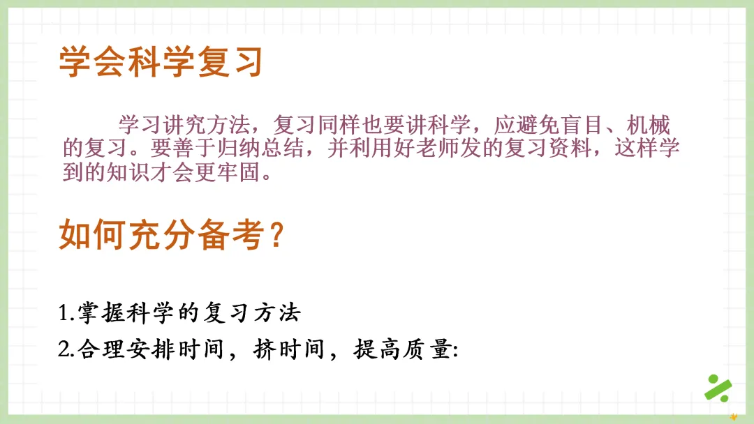 学会科学复习,学习讲究方法,复习同样也要讲科学,应避免盲目、机械的复习。要善于归纳总结,并利用好老师发的复习资料,这样学到的知识才会更牢固。让我们掌握科学的复习方法,提高复习效果。