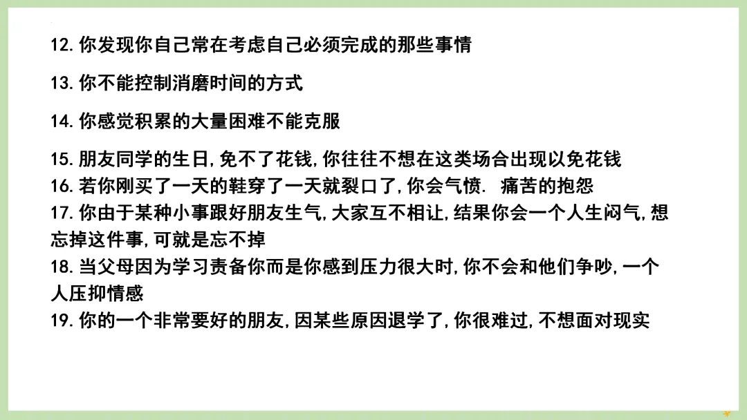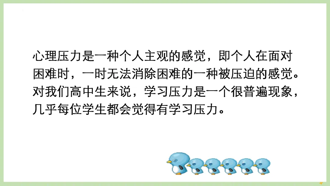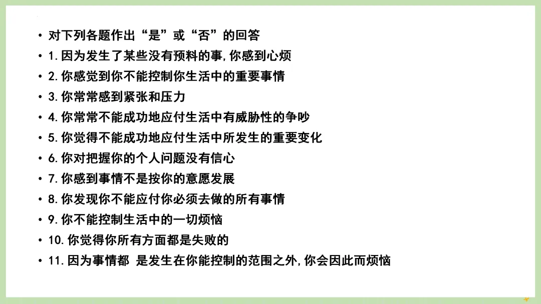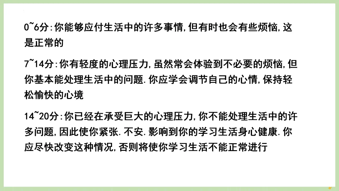现在,我们来做一个小测试,了解一下自己的心理压力状况。评分规则:“是”为1P26:小测试结果分析