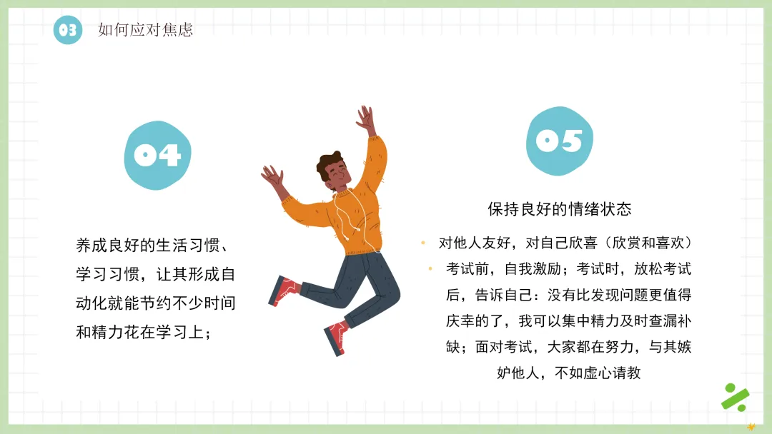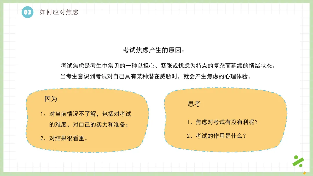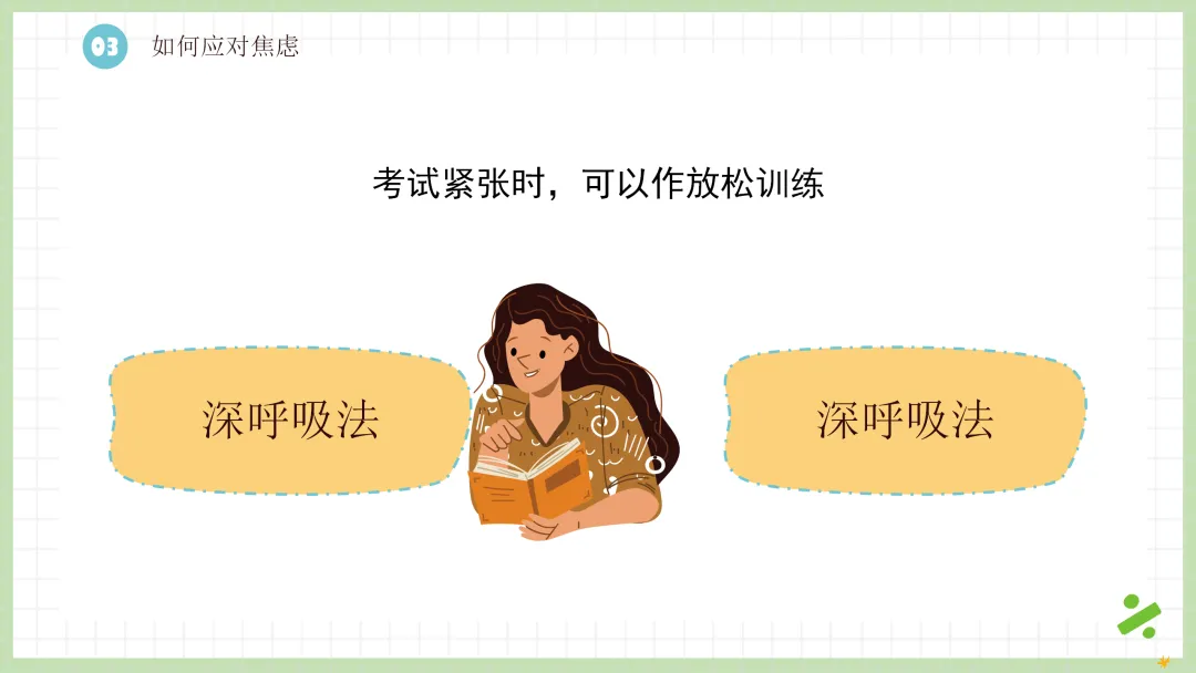 考试紧张时,可以作放松训练,采用深呼吸法来缓解紧张情绪。让我们在考试中,运用深呼吸法,保持冷静。