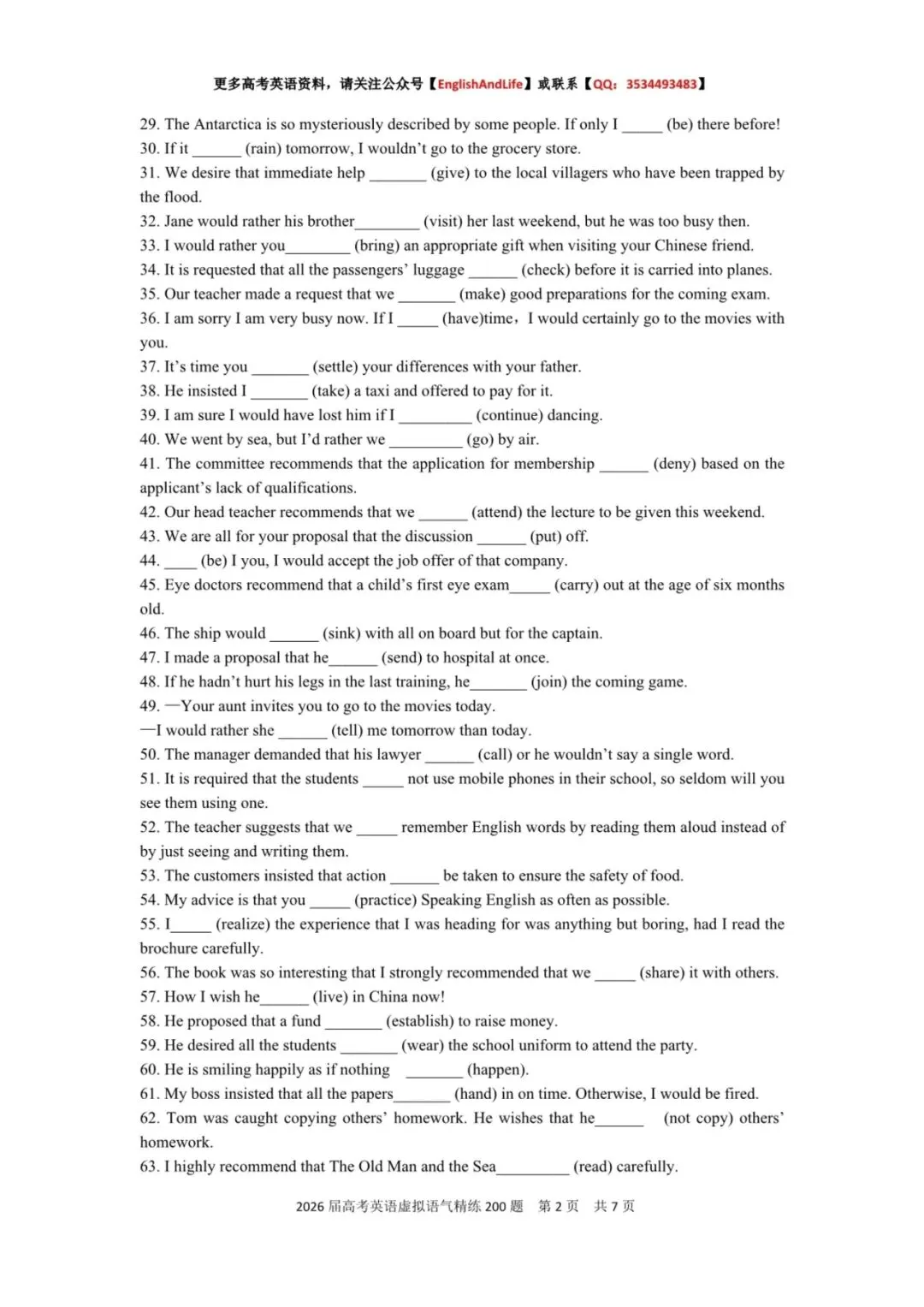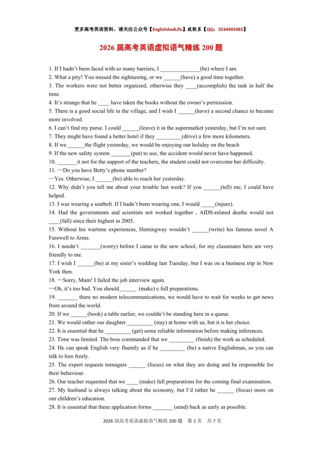 获取《2026届高三一轮复习之虚拟语气精讲及精练200题(含答案+解析)》的方法: