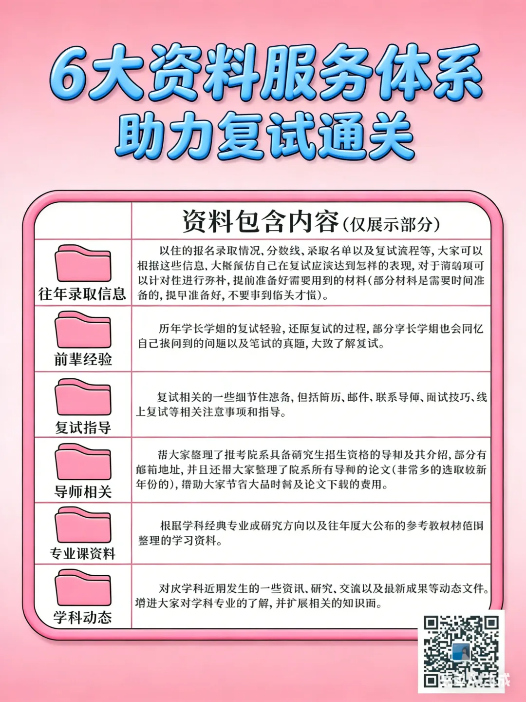 复试包按学院整理6大模块的复试资料包,覆盖面广,在复试资讯上可以帮大家省下不少时间和费用,分别包括以下内容(受欢迎ing,需要的提前下单预定哈,因为需要的多,订单排队中)