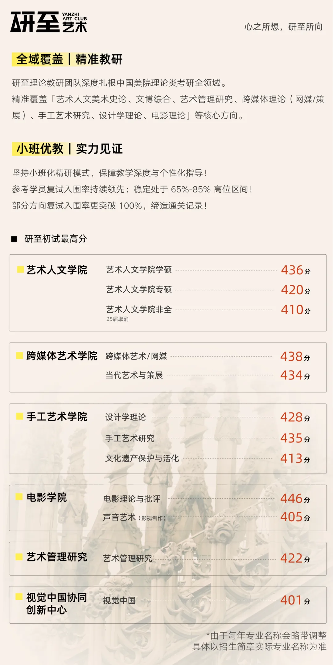 研至理论教研团队深度扎根中国美院理论类考研全领域。精准覆盖「艺术人文美术史论、文博综合、艺术管理研究、跨媒体理论(网媒/策展)、手工艺术研究、设计学理论、电影理论、视觉中国」等核心方向。