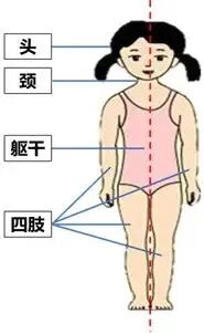 身体的组成部分:我们的身体从上到下由头、颈、躯干和四肢组成。头部有眼睛、耳朵、鼻子、嘴巴等器官;颈部连接着头和躯干;躯干包括胸部和腹部,内部有心脏、肺、胃、肠等重要器官;四肢包括上肢和下肢,用于运动和操作物体。