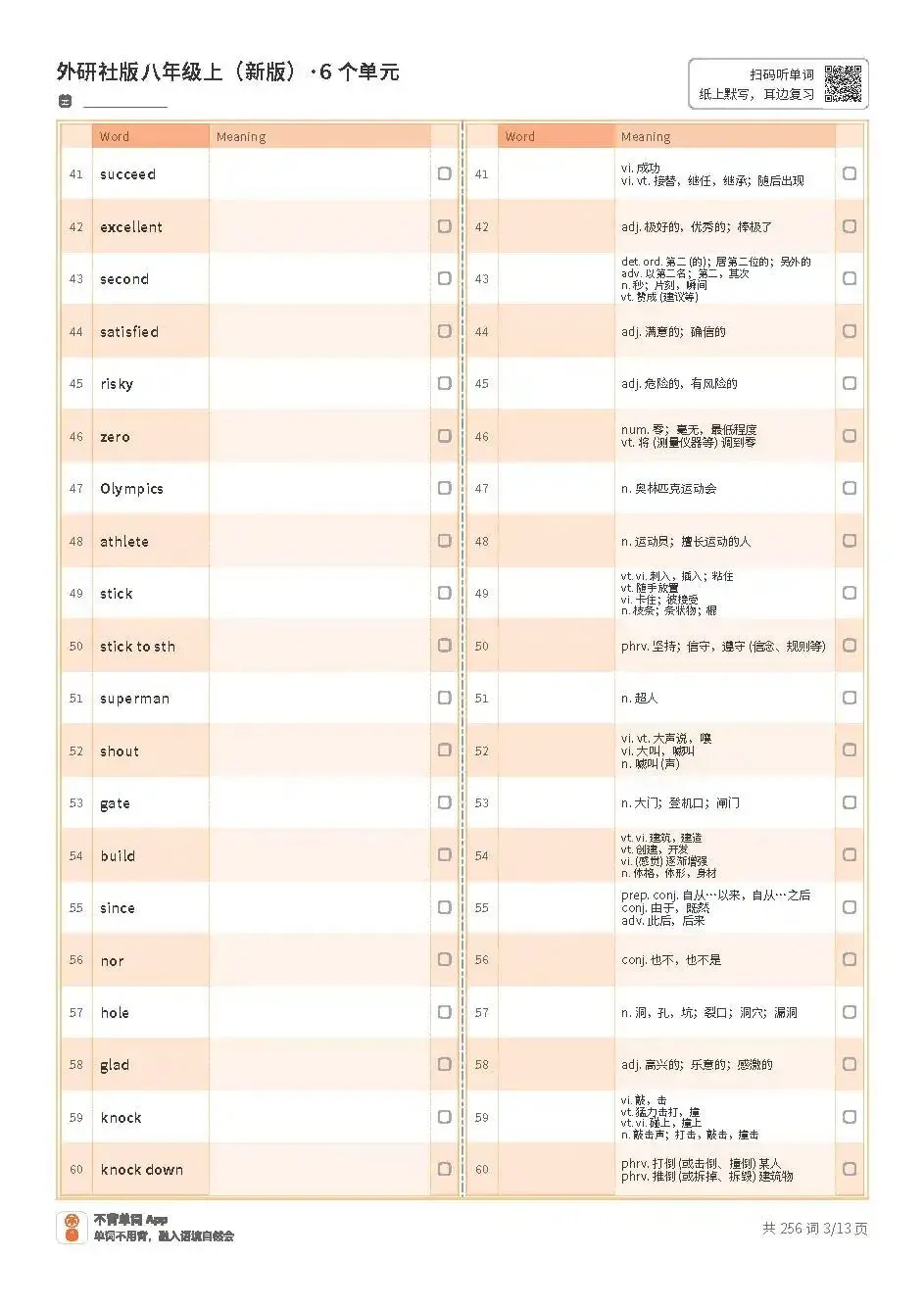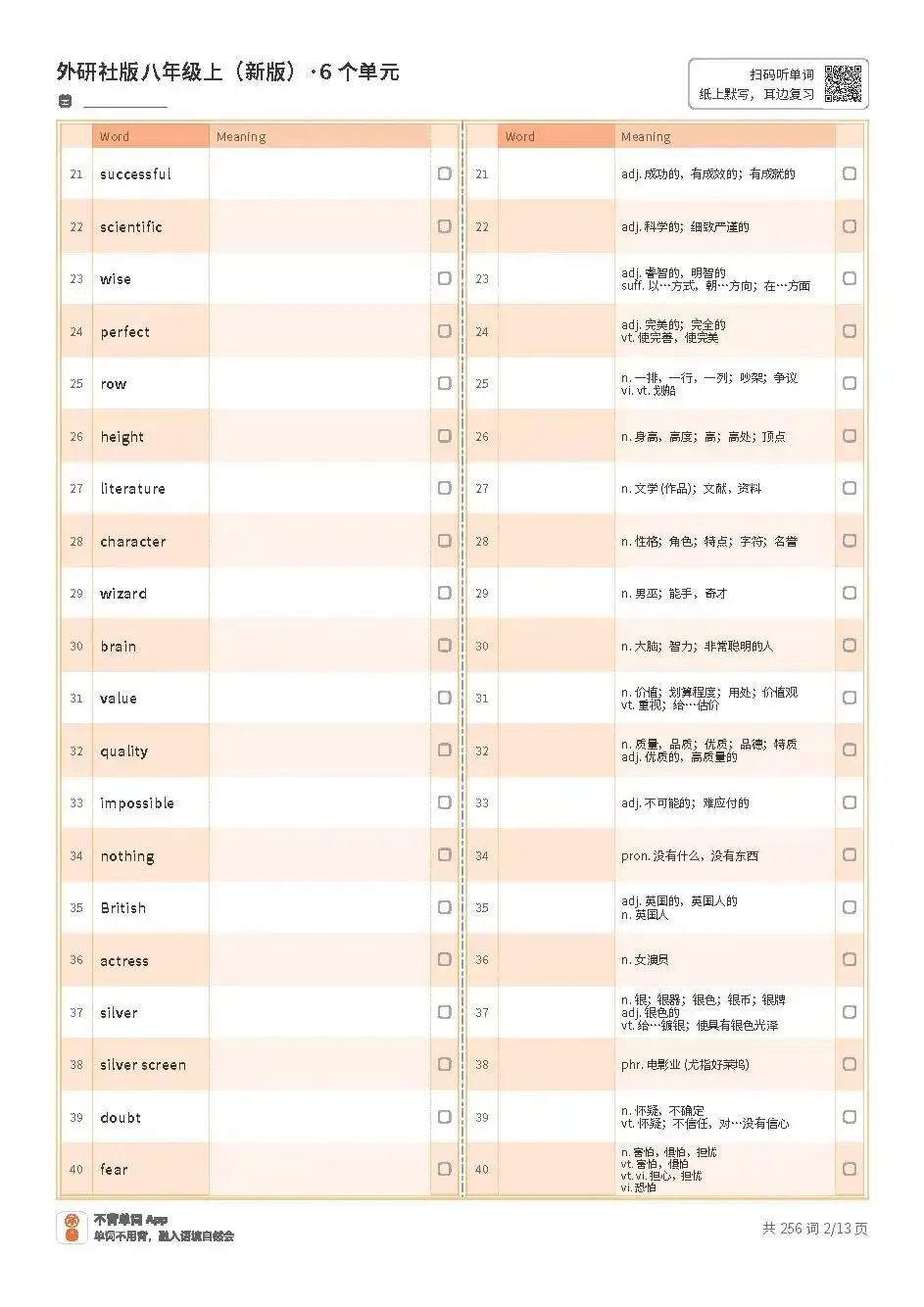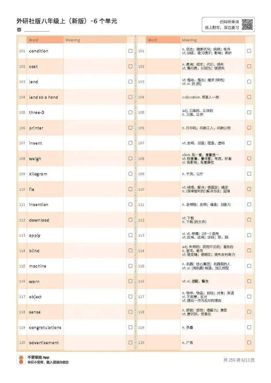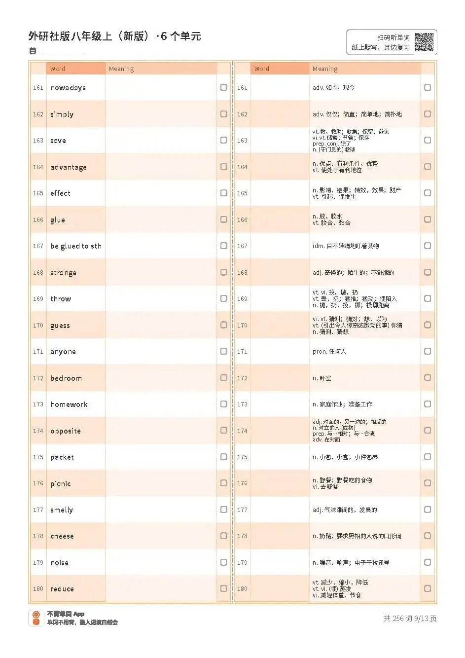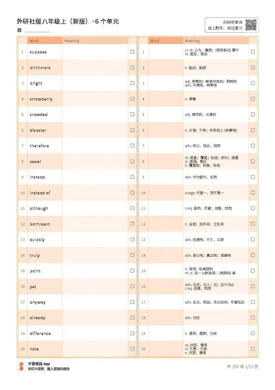 初中期末复习 | 新外研八上英语Unit1~Unit6单词表(适合打印练习,文末内附PDF免费获取方式)