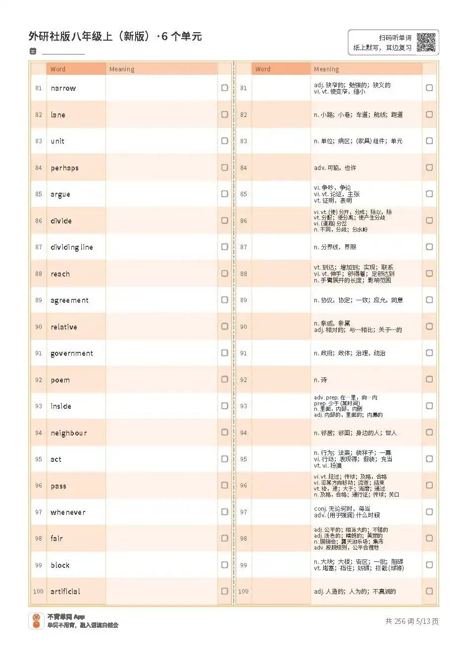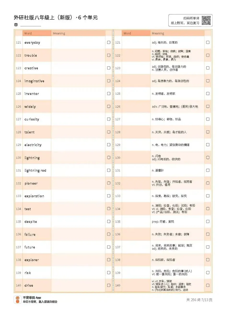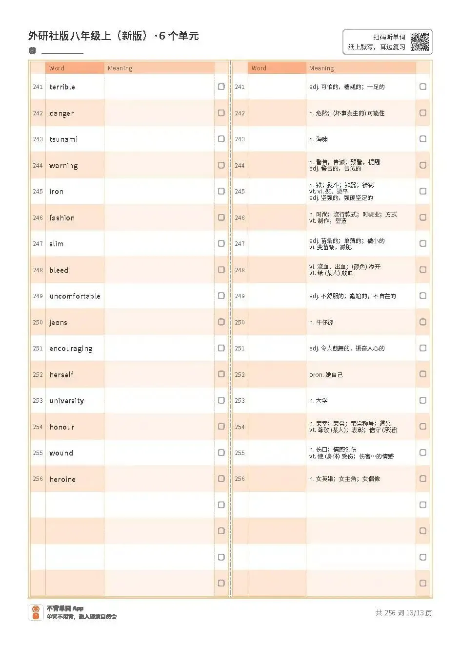 >初中期末复习 | 新外研八上英语Unit1~Unit6单词表(适合打印练习,文末内附PDF免费获取方式)