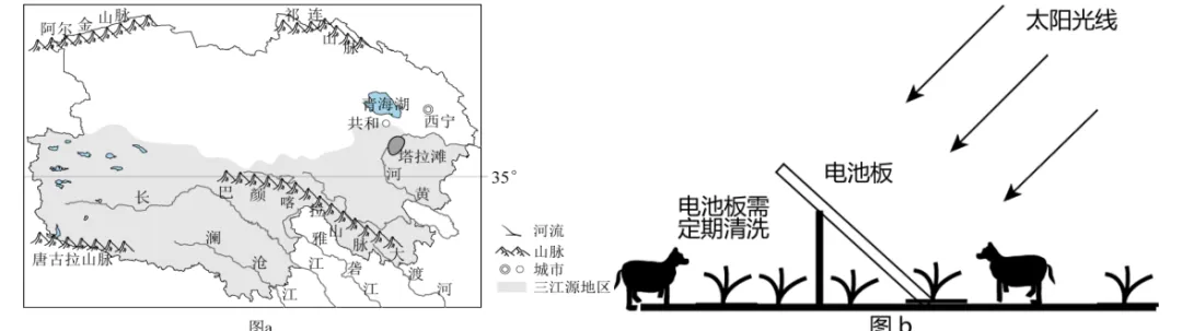 【示例】青海省塔拉滩地处三江源地区,以戈壁沙丘为主,风沙灾害严重。这里大力发展光伏产业,如今的塔拉滩已形成了“光伏+牧场+生态”的绿色发展新模式(图b)。图a为青海省简图。读图,完成下面小题。