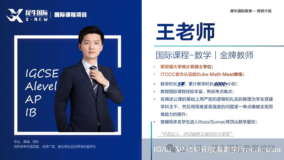 犀牛国际专注数学领域教学多年,组建了数学竞赛&数学类学科国际课程超牛师资、教研团队,研发全知识点覆盖的IB课程,开设IB数学冲刺班、培优班,从课程设置,学习资料,师资配置等多个方面给学生强助攻!此外,IB课程寒假班还开设IB化学、IB物理、IB生物、IB经济等科目,其他科目也可一对一辅导。