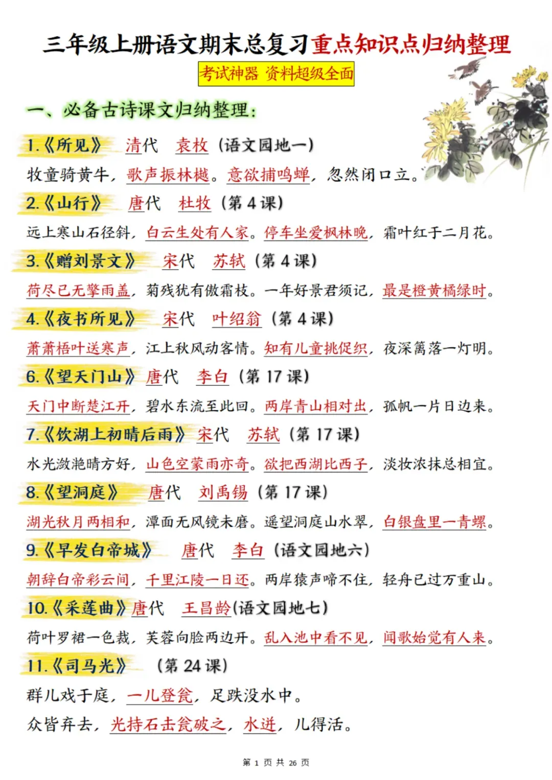 最近,后台不少家长学生询问学习资料,今天王老师准备了三年级上册语文期末总复习重点知识点归纳整理,家长记得给孩子收藏学习哦!