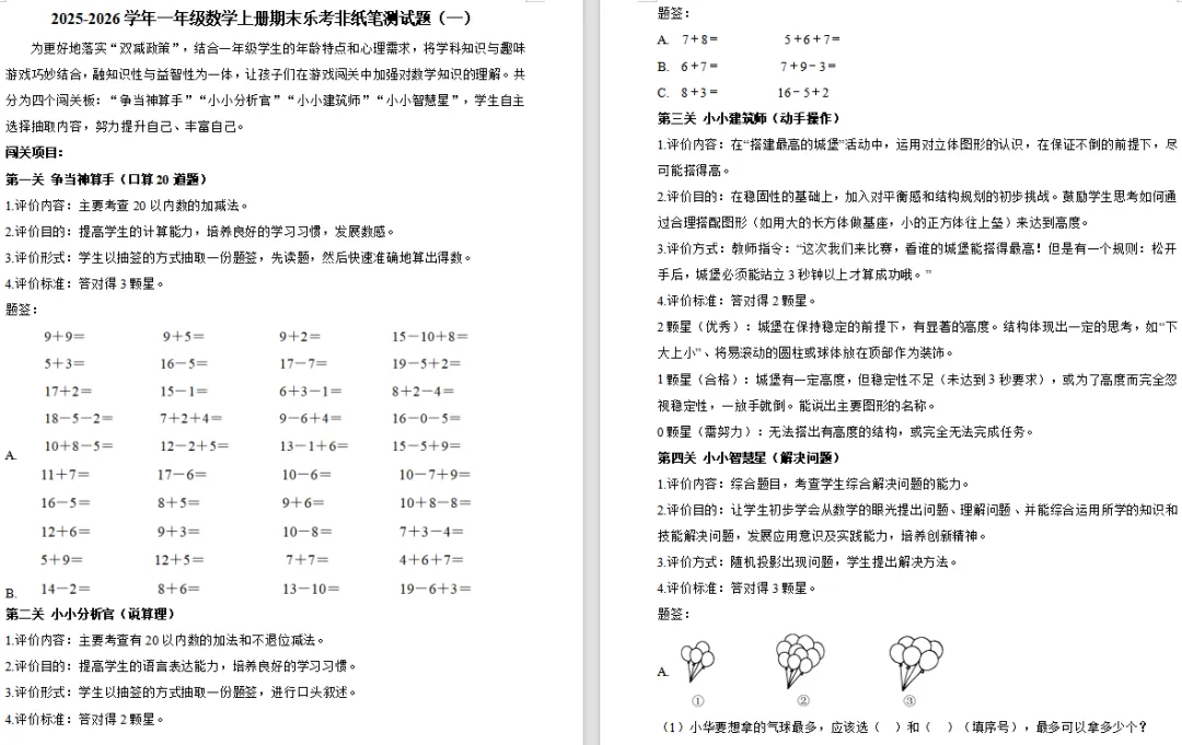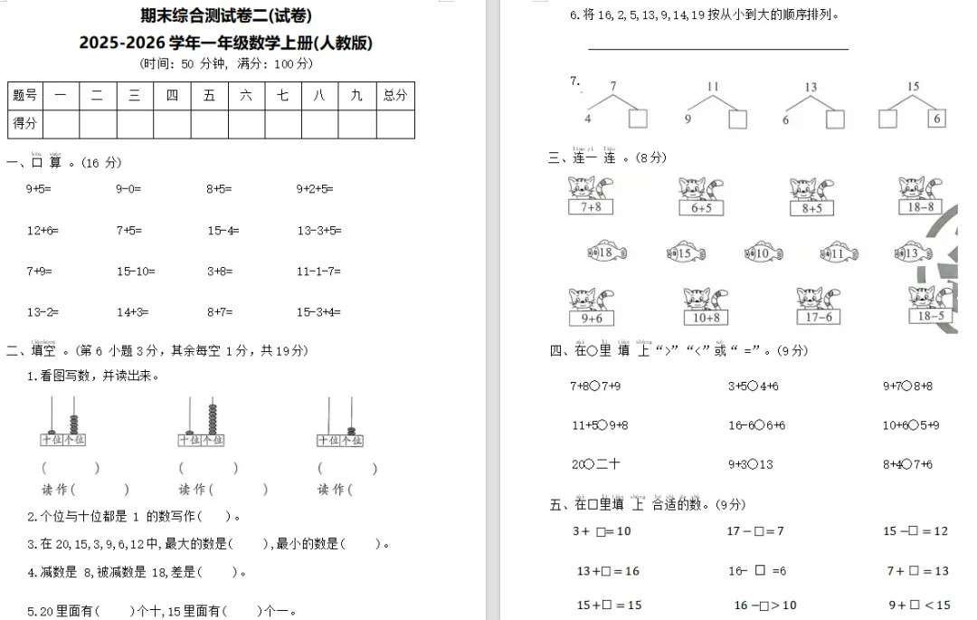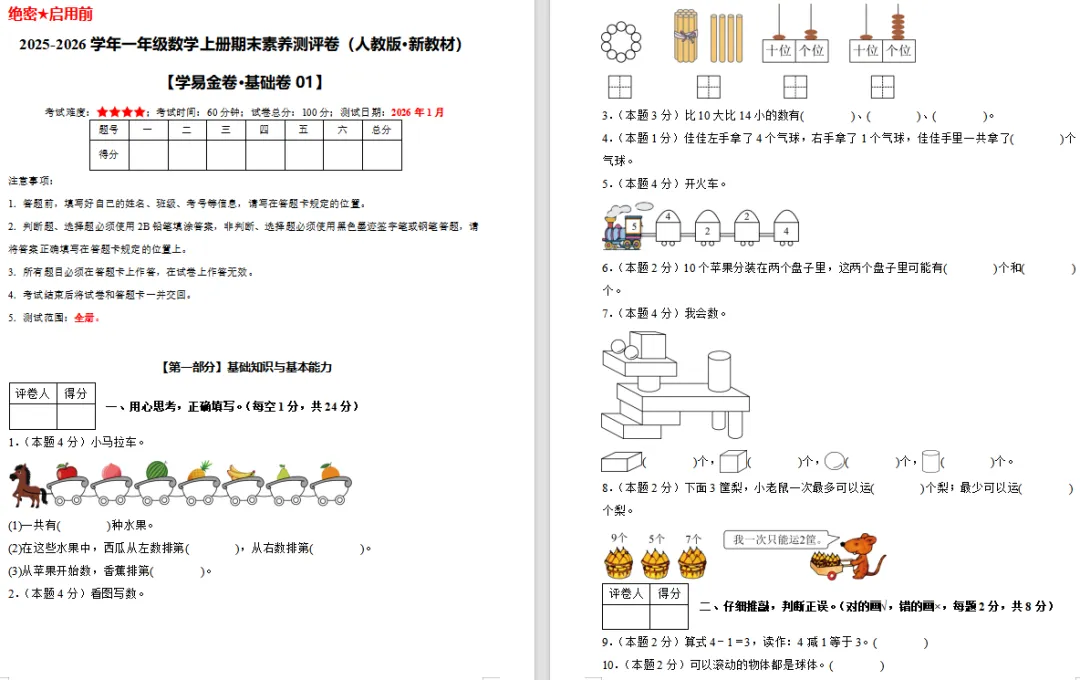 【复习资料】2026人教版小学一年级数学上册多套期末综合测试卷A3/A4排版含答案(全套下载)