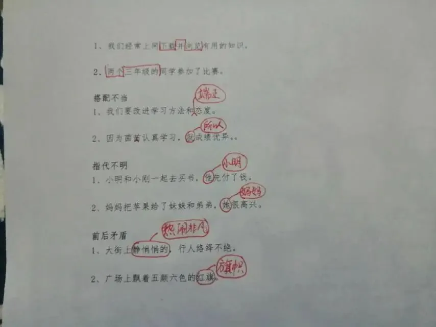 三年级上册所学的病句类型相对基础,主要集中在成分残缺、搭配不当、语义重复、语序混乱、前后矛盾、指代不明这 6 类。