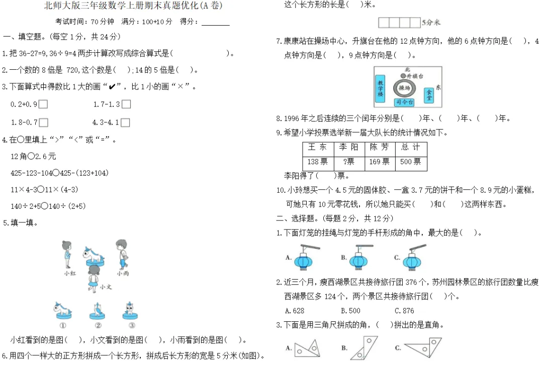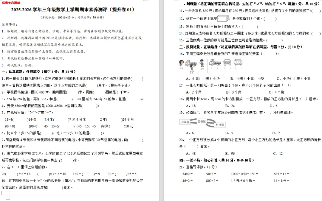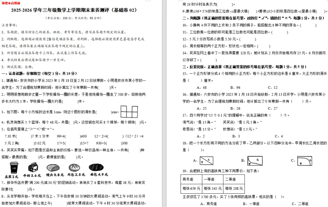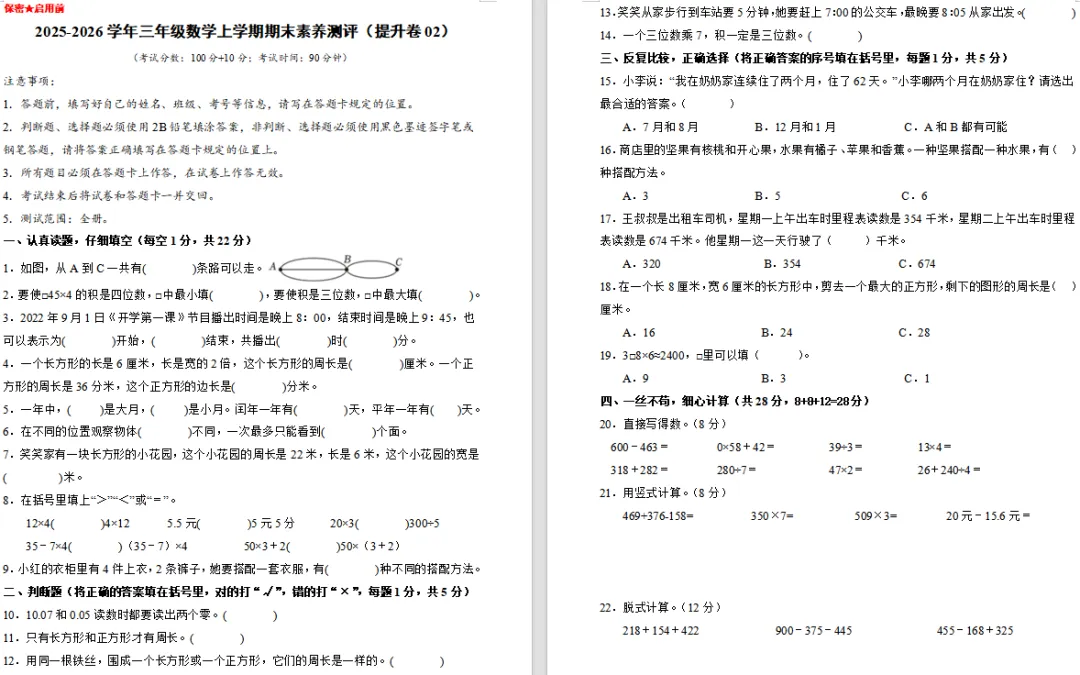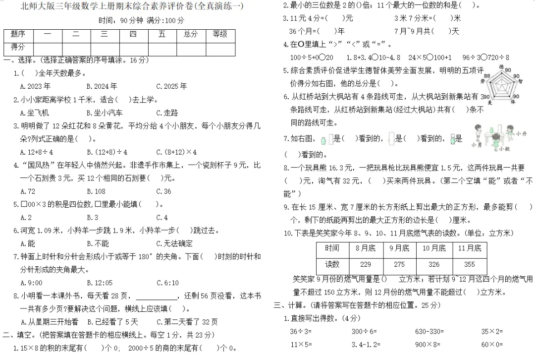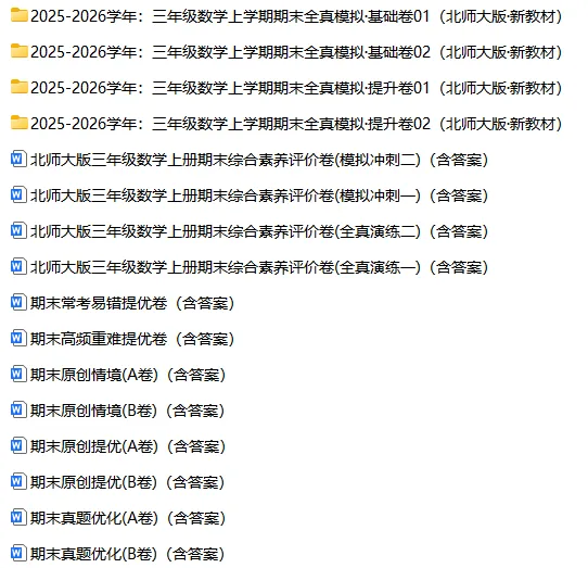 >【复习资料】2026北师大版小学三年级数学上册多套期末综合测试卷A3A4排版含答案(全套下载)