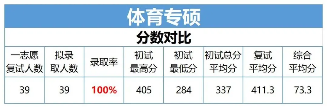 全日制体育专硕一志愿进复39人,拟录取39人,录取率为100%;统考各科目平均分总分337