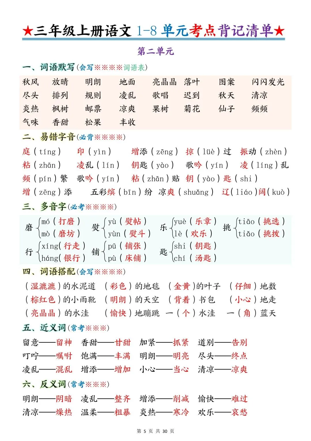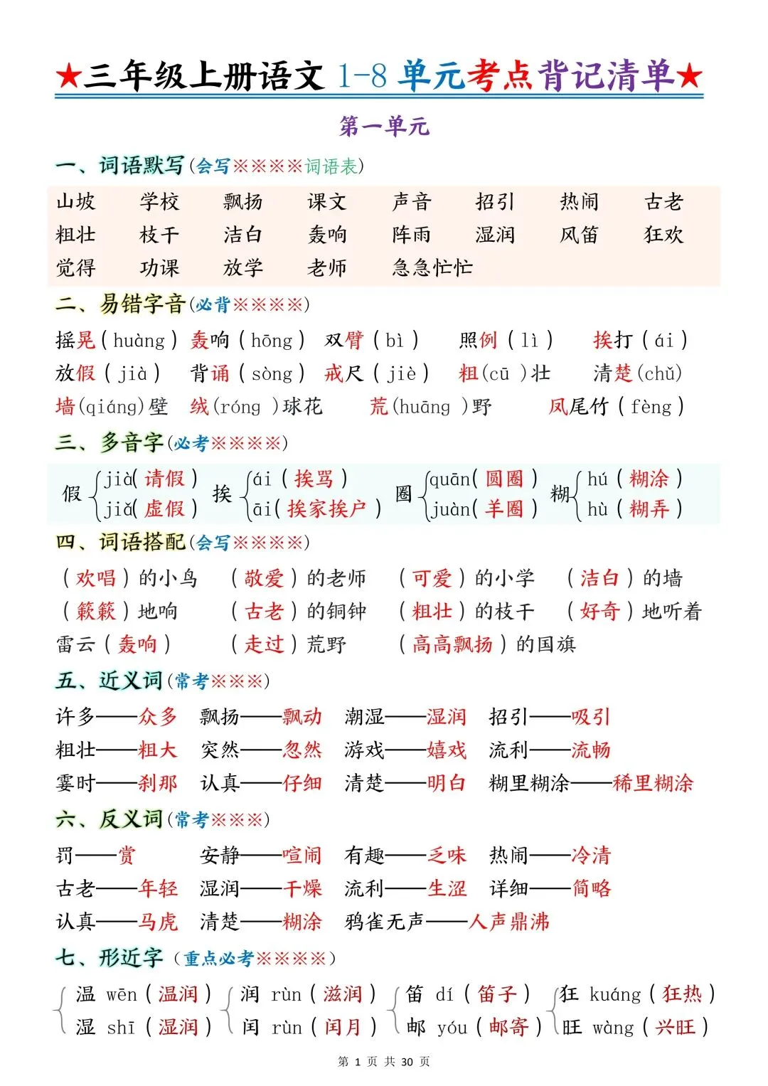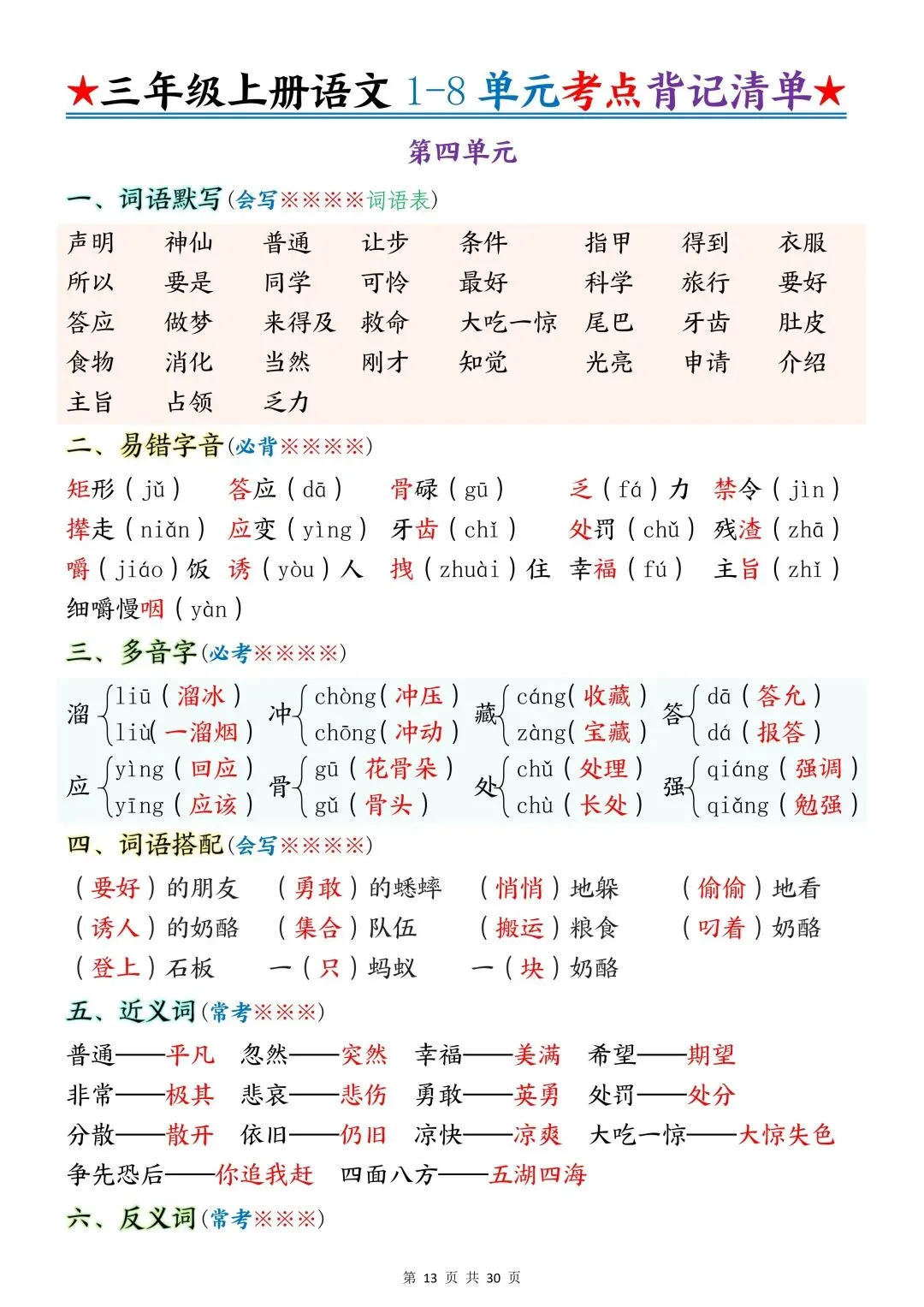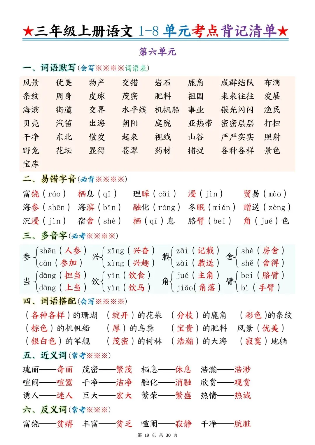 包含词语默写、易错字音、多音字、词语搭配、近反义词、全册必背古诗+文言文、课文优秀人物品质及说明道理、日积月累、口语交际、词语积累、形近字组词等常考知识点汇总。