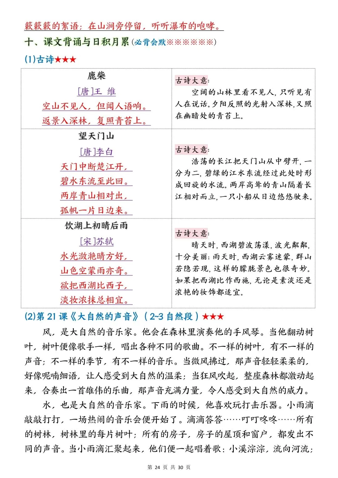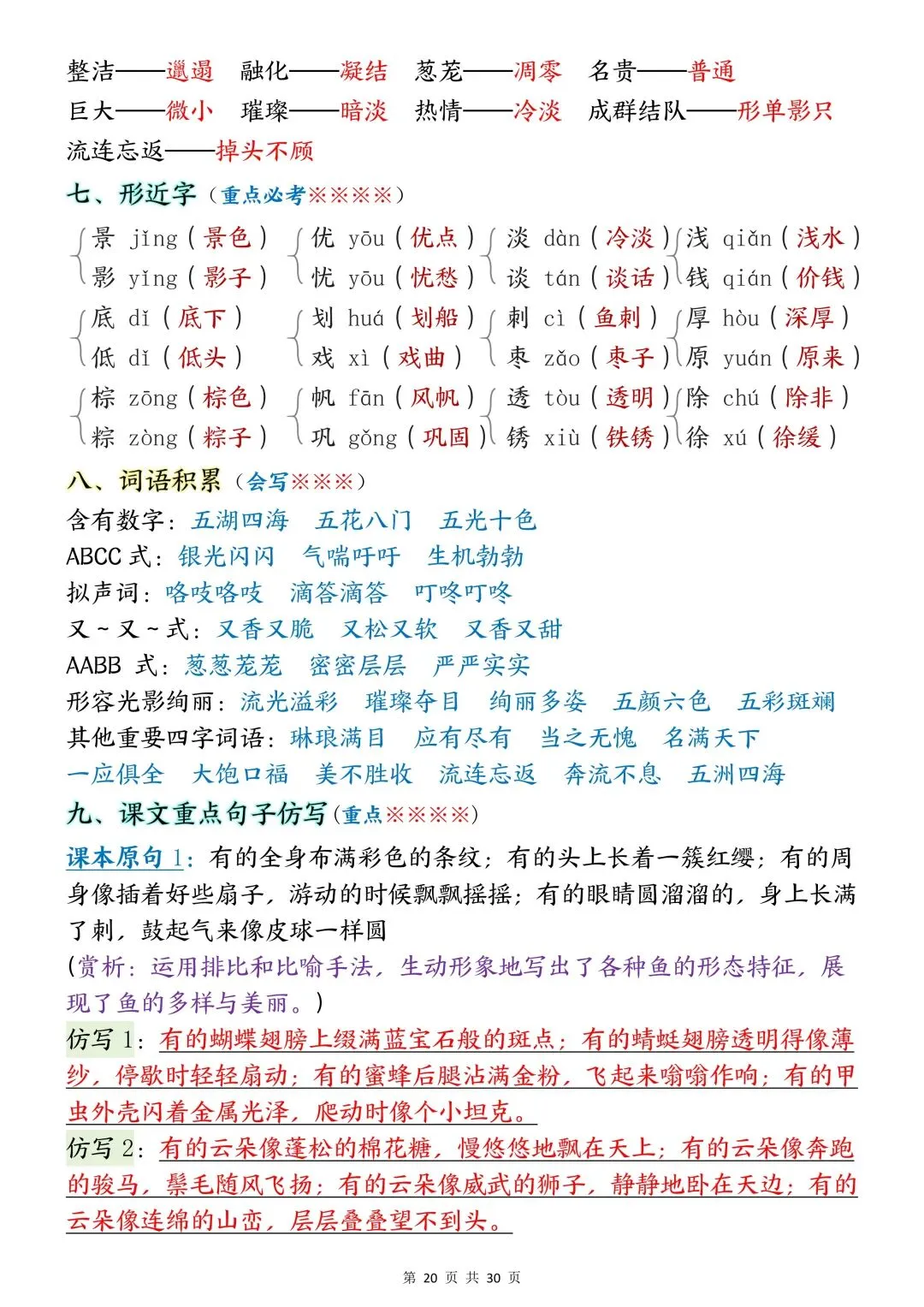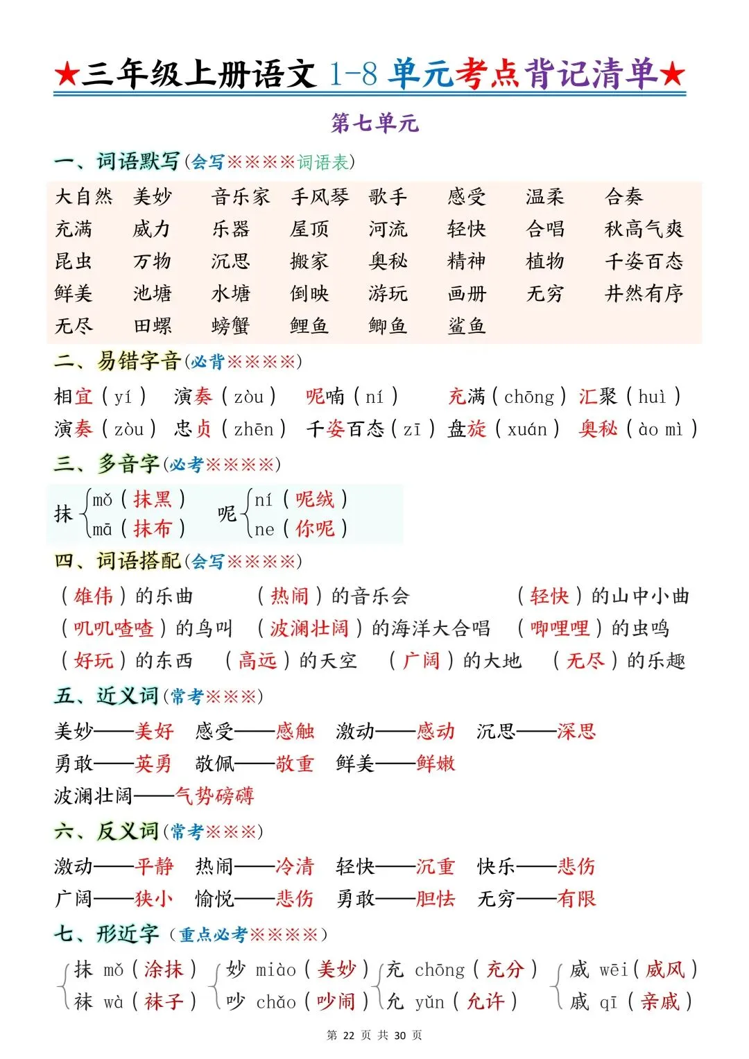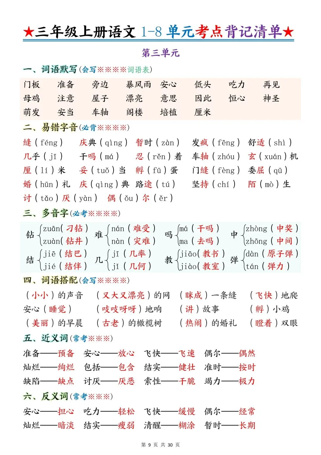 包含词语默写、易错字音、多音字、词语搭配、近反义词、全册必背古诗+文言文、课文优秀人物品质及说明道理、日积月累、口语交际、词语积累、形近字组词等常考知识点汇总。