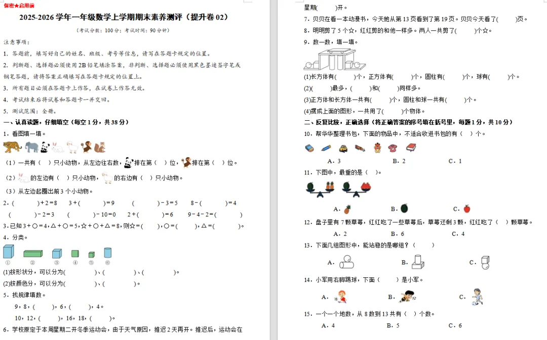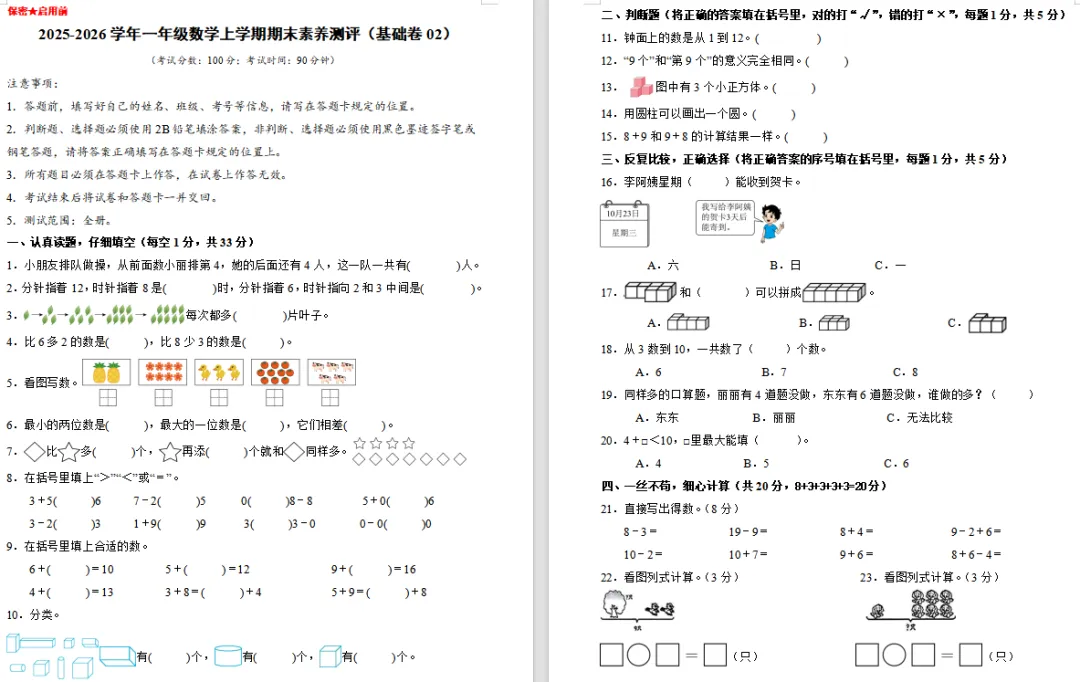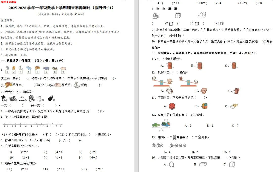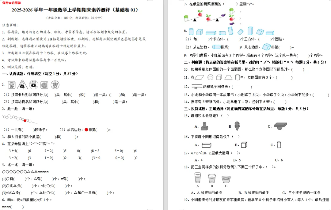 >【复习资料】2026北师大版小学一年级数学上册多套期末综合测试卷A3A4排版含答案(全套下载)