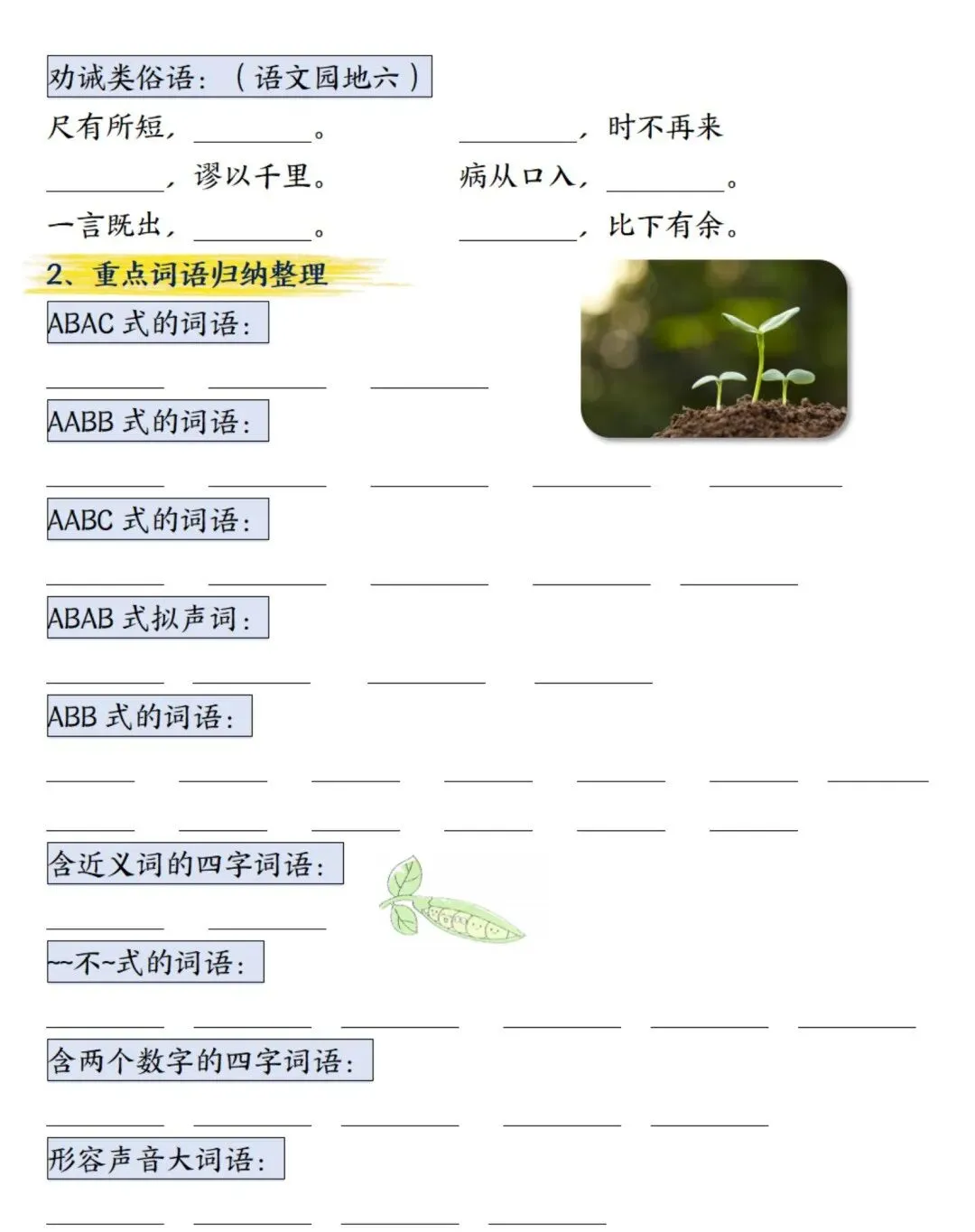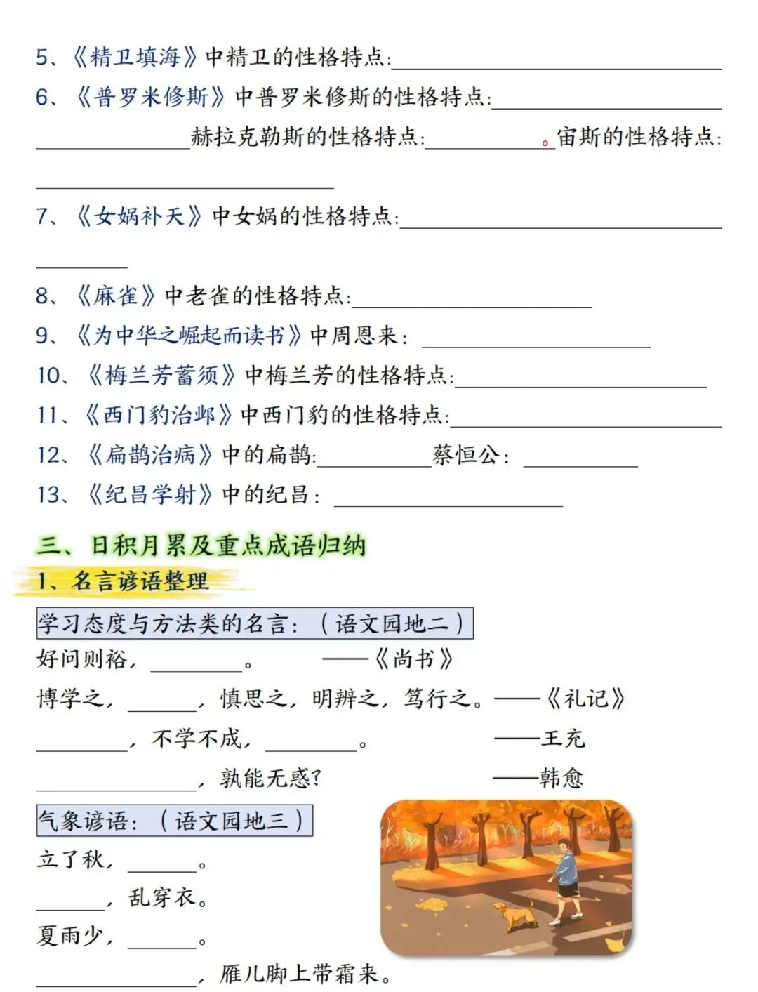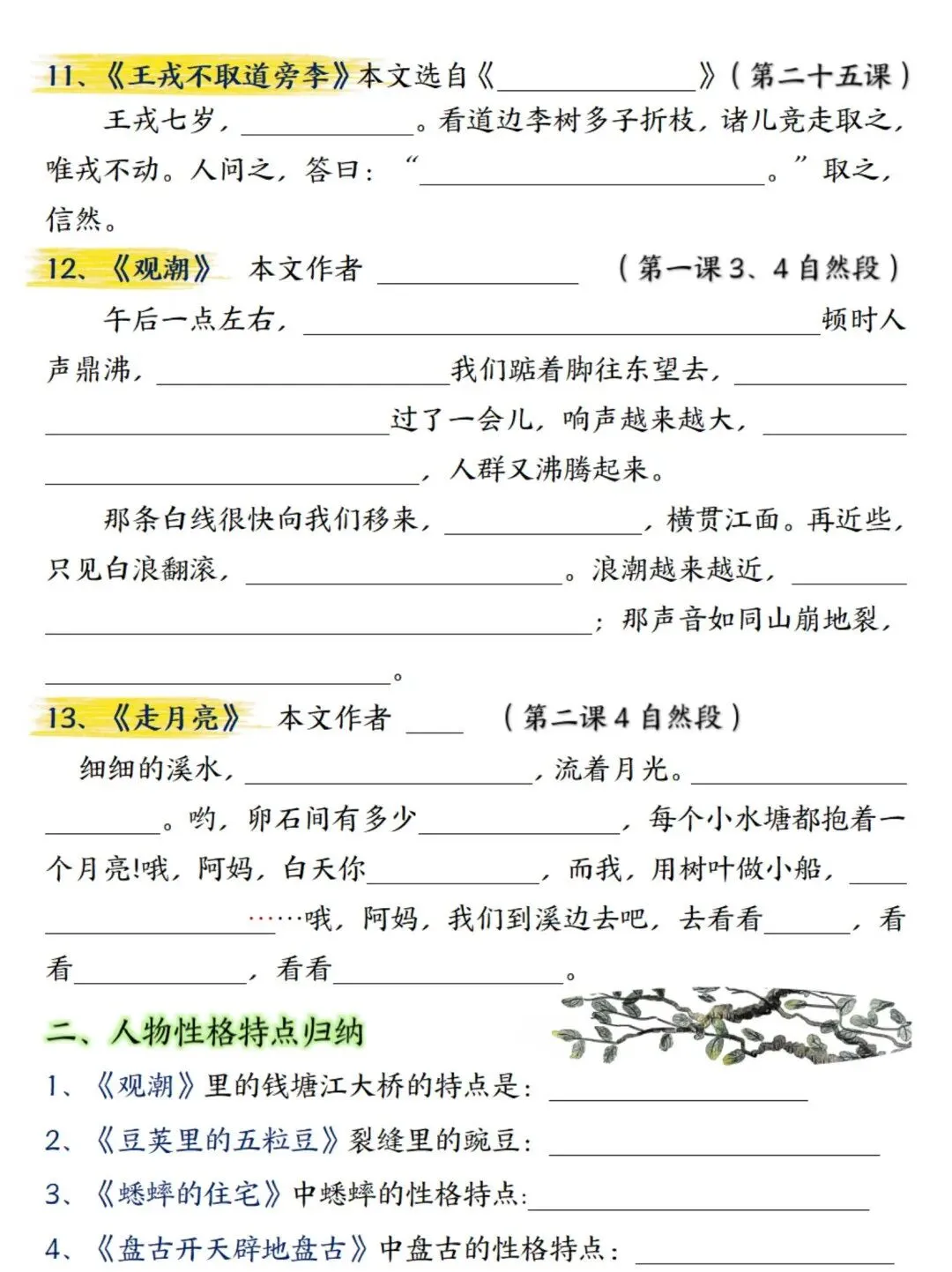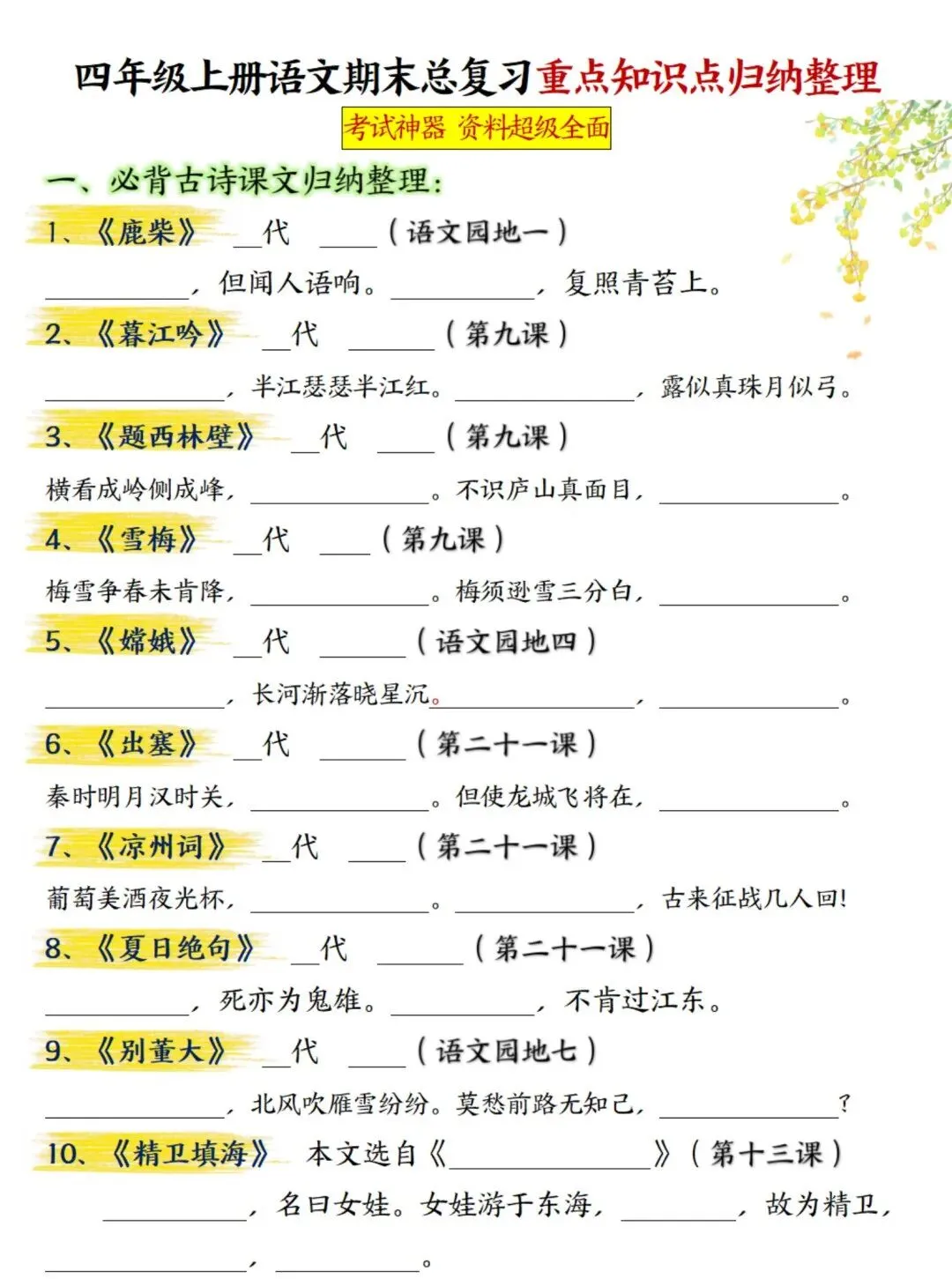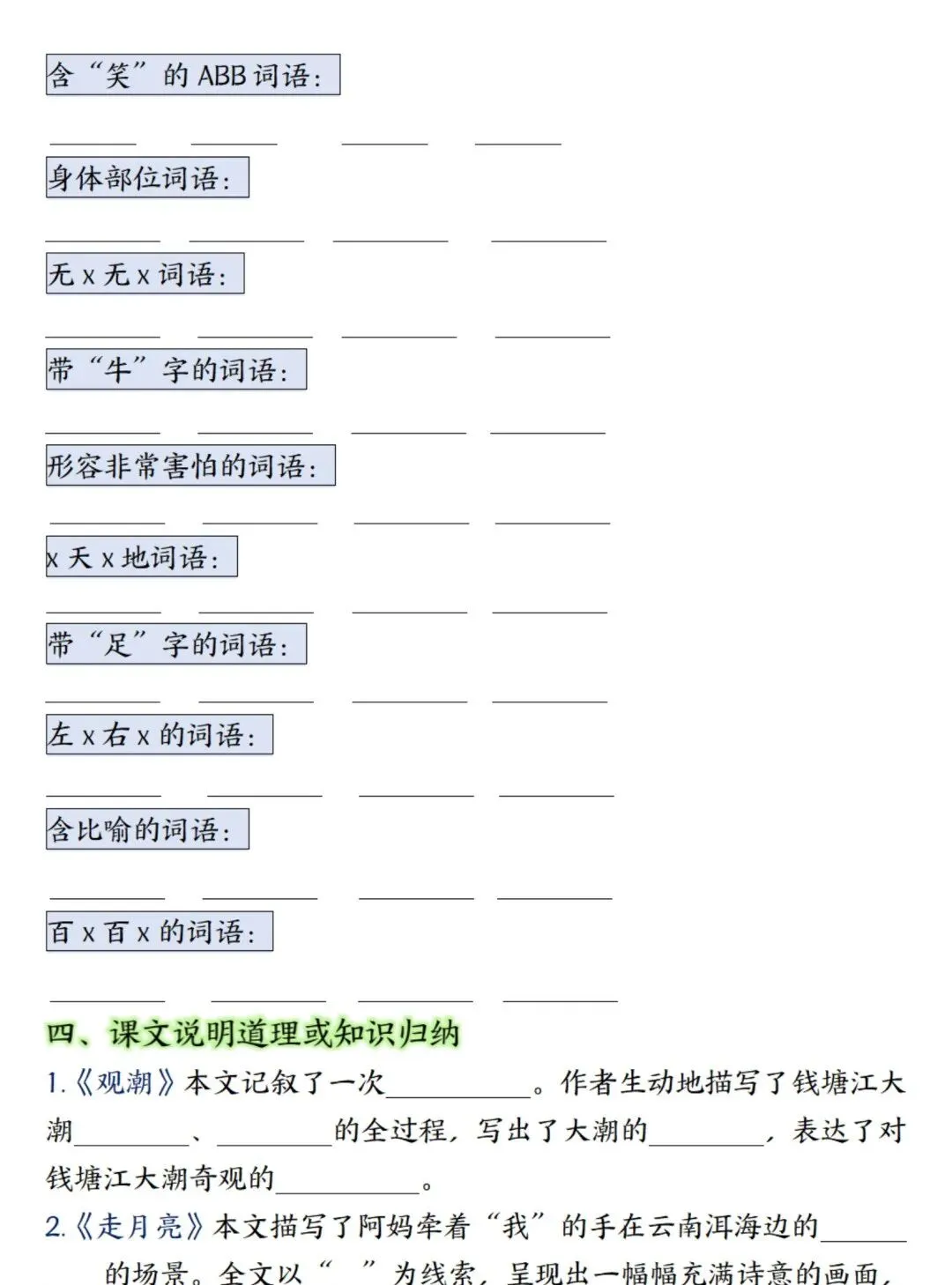 新四年级上册语文期末总复习重点知识点归纳整理(空白+答案),超全,电子档可下载