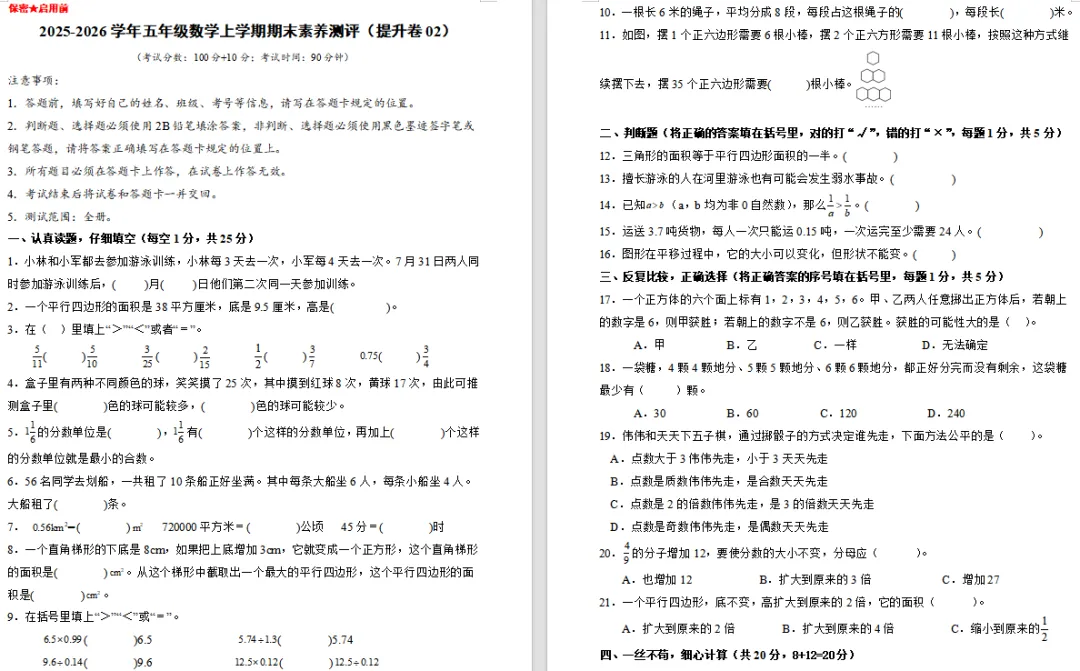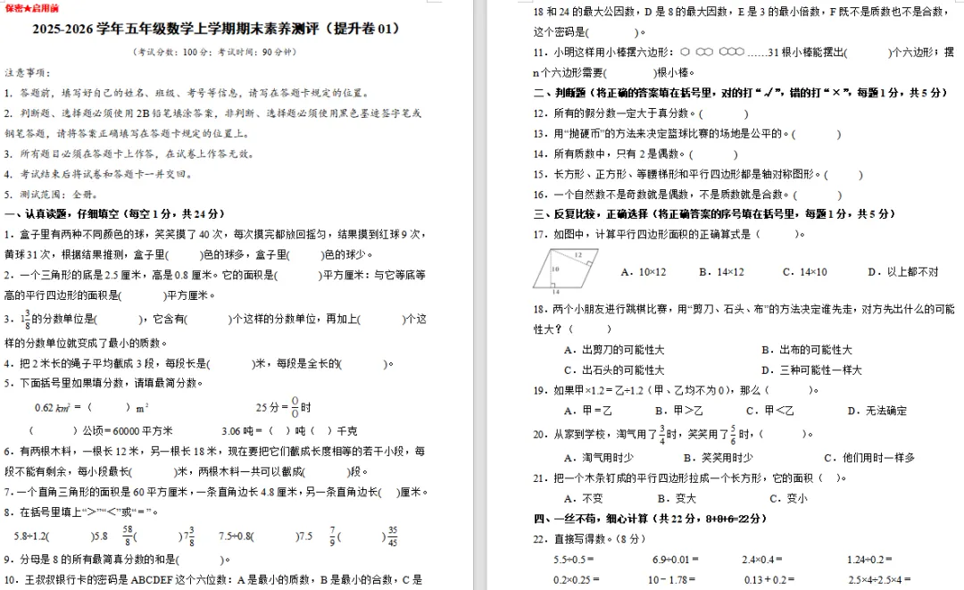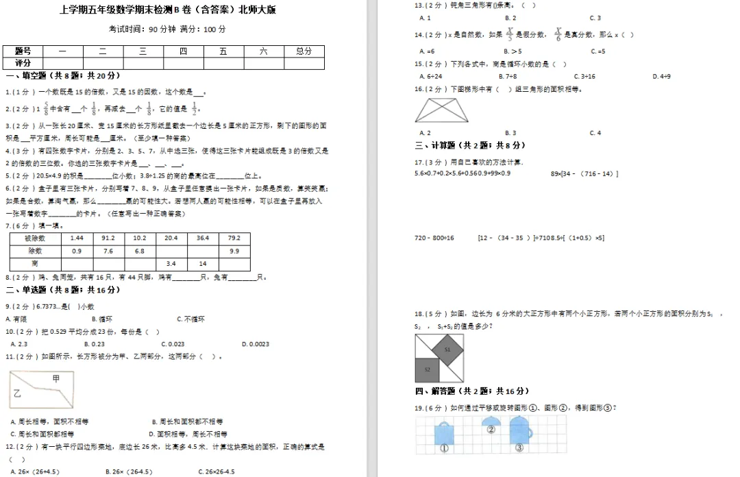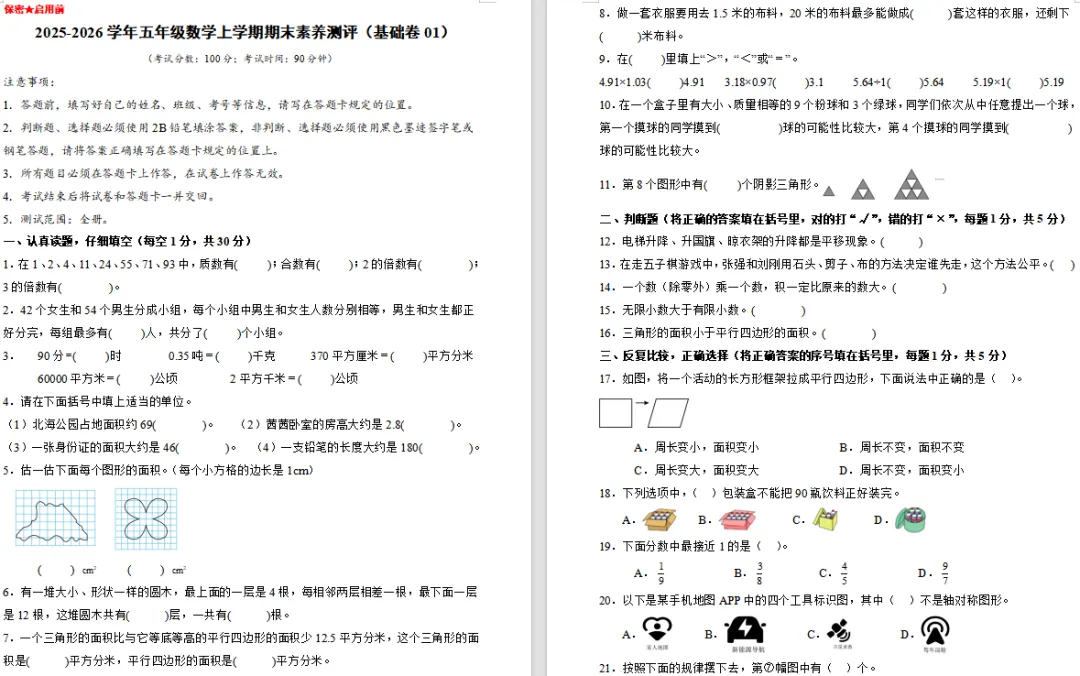 >【复习资料】2026北师大版小学五年级数学上册多套期末综合测试卷A3A4排版含答案(全套下载)