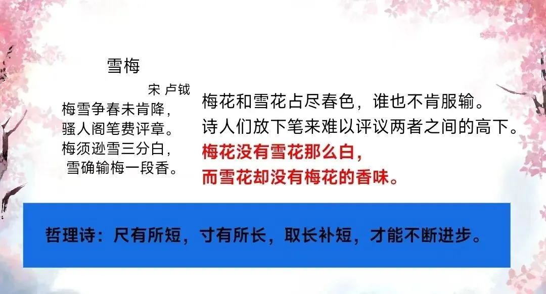 假如没有梅花,就不能映衬出雪的洁白无瑕;没有雪的寒冷,也就不能显出梅花不畏风霜,吐露芬芳的高贵品格。每个人都有长处和短处,我们要取长补短,才能相得益彰。