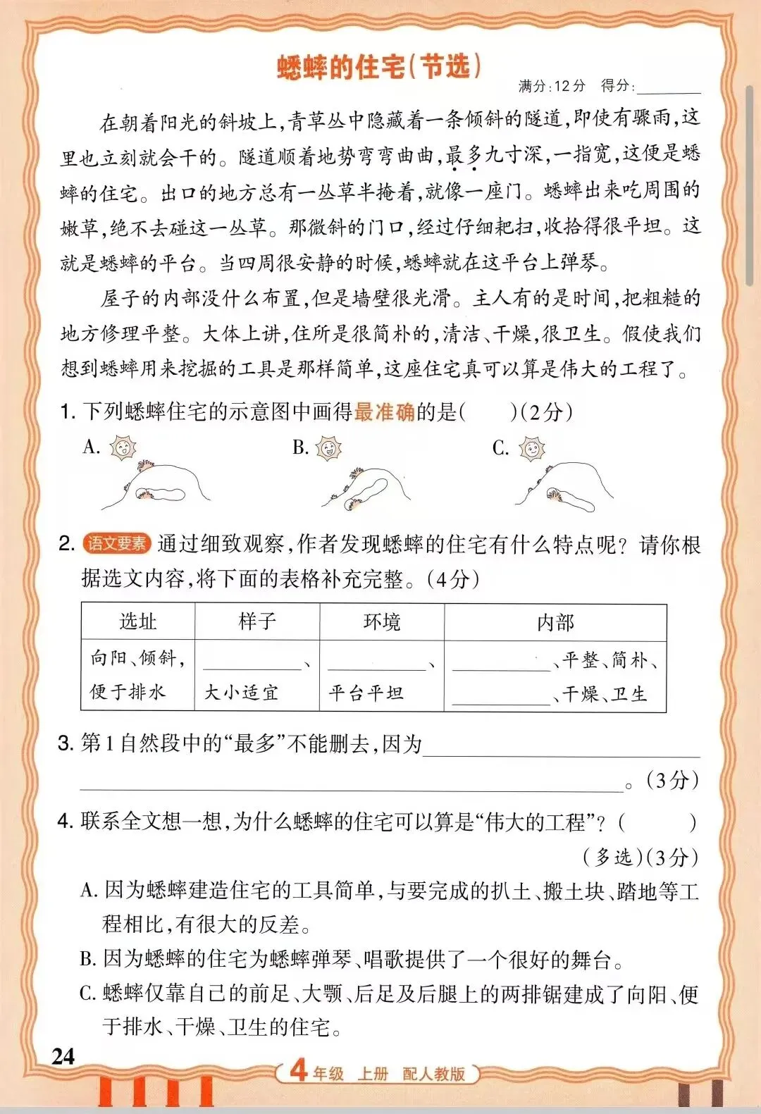 2、用自己的话介绍蟋蟀住宅的修建过程。作者是怎样观察的?