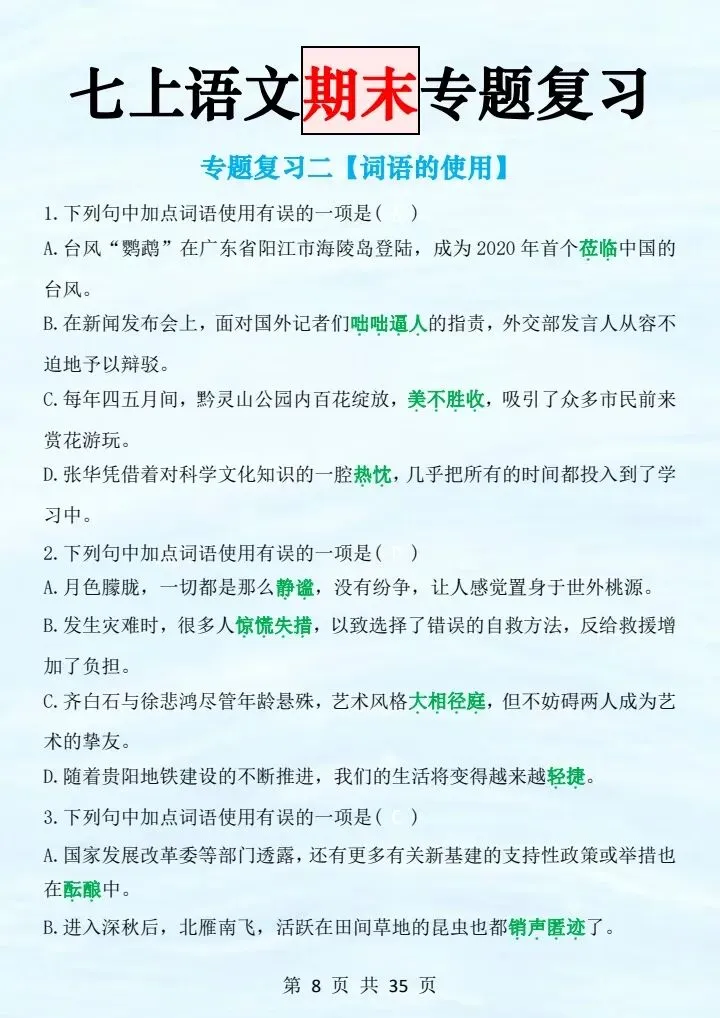 别急,为了帮助七年级的孩子在期末考试中弯道超车,我连夜整理了这份《七年级(上)语文期末专题复习》精华资料。