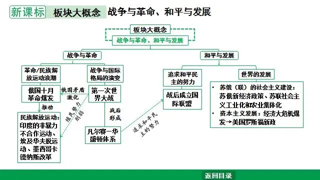 • 核心内容:第一次世界大战的爆发与进程、凡尔赛—华盛顿体系的建立、俄国十月革命的胜利。