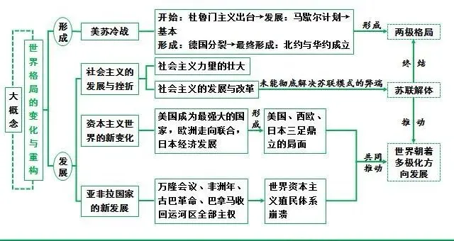 • 历史脉络:二战后,美苏战时同盟破裂,1947年杜鲁门主义出台,冷战开始,北约与华约的成立标志着两极格局正式形成;二战后资本主义国家通过国家干预经济、科技革命等方式实现经济复苏与发展,出现新的变化;苏联及东欧社会主义国家进行改革,但多以失败告终,为后来的剧变埋下隐患。